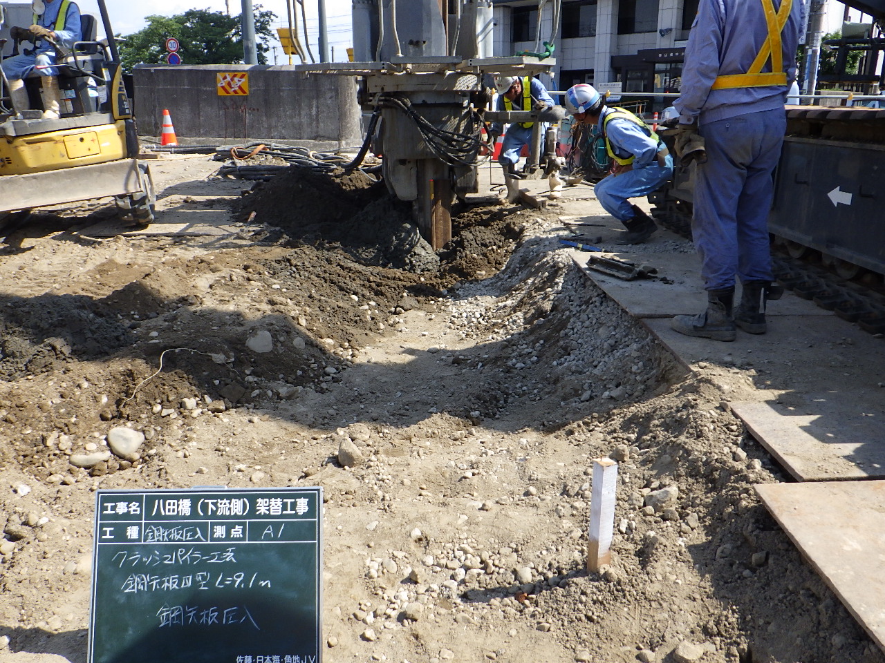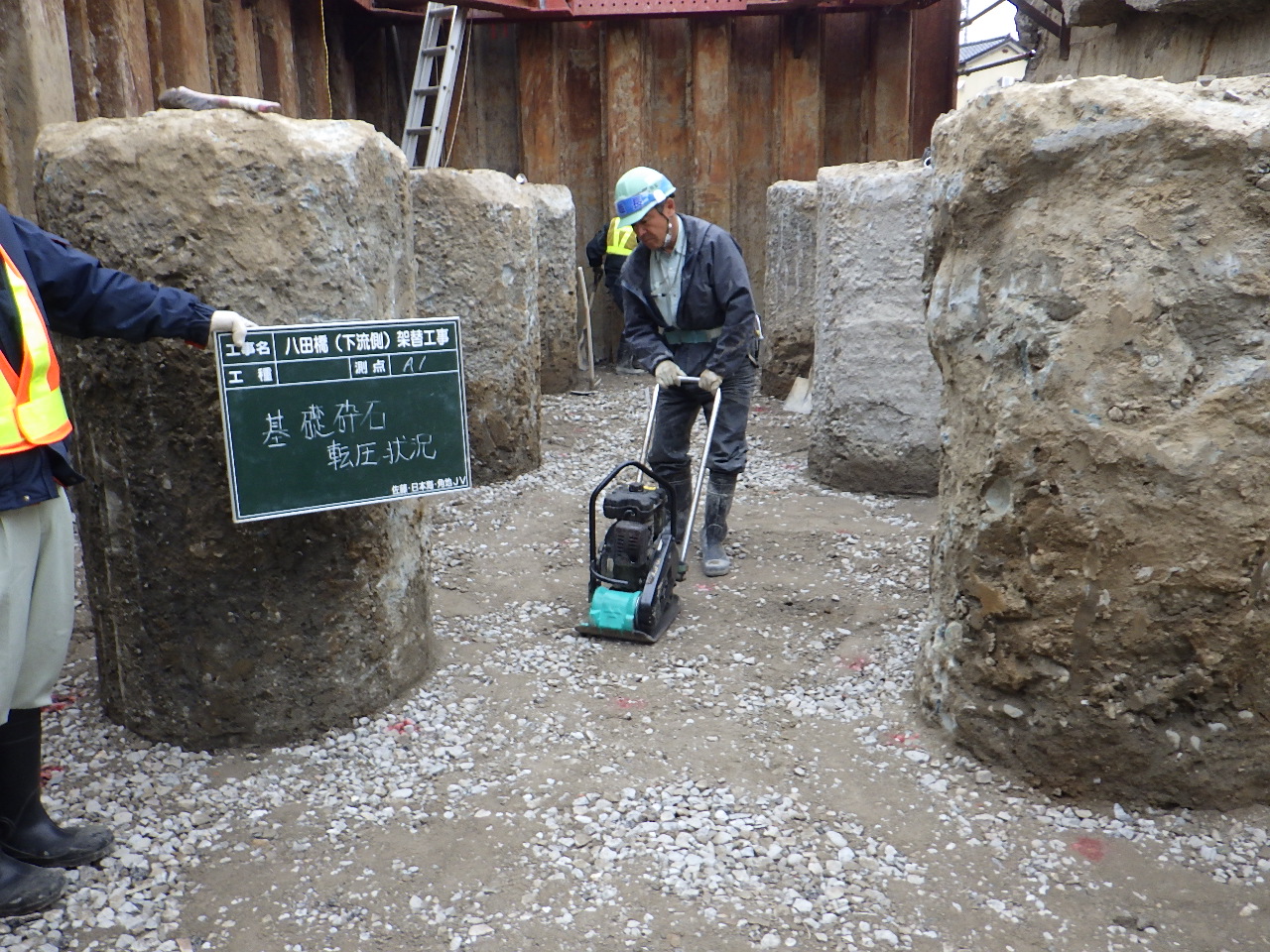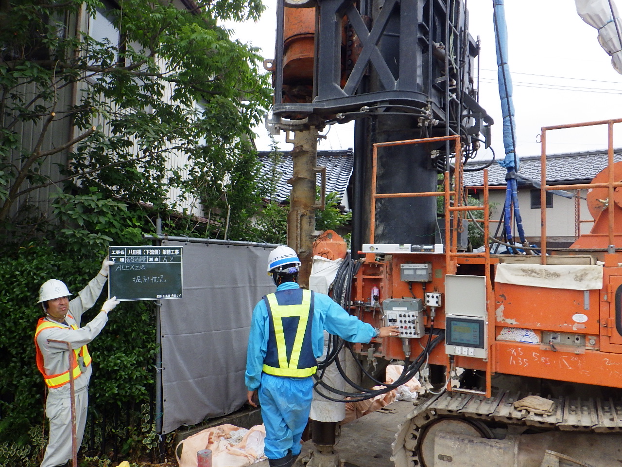 基礎杭はA2ついでA1の順に打設した。杭径はφ1,000で、長さは26.5~27mほど。これを橋台1つに付き8本施工した。施工方法はオールケーシングで先行掘削し、鉄筋かごを挿入、コンクリートを打設するというもの。騒音は先述の理由から70db以下にするよう注意を払っている。橋台2基合計1か月半で施工を完了した。