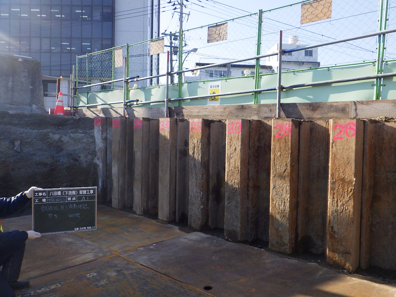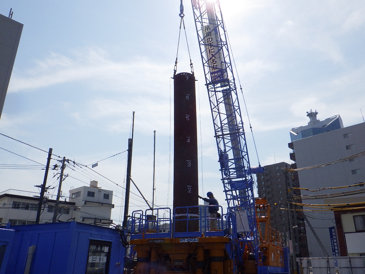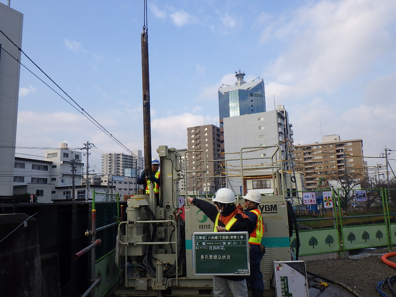基礎杭はA2ついでA1の順に打設した。杭径はφ1,000で、長さは26.5~27mほど。これを橋台1つに付き8本施工した。施工方法はオールケーシングで先行掘削し、鉄筋かごを挿入、コンクリートを打設するというもの。騒音は先述の理由から70db以下にするよう注意を払っている。橋台2基合計1か月半で施工を完了した。