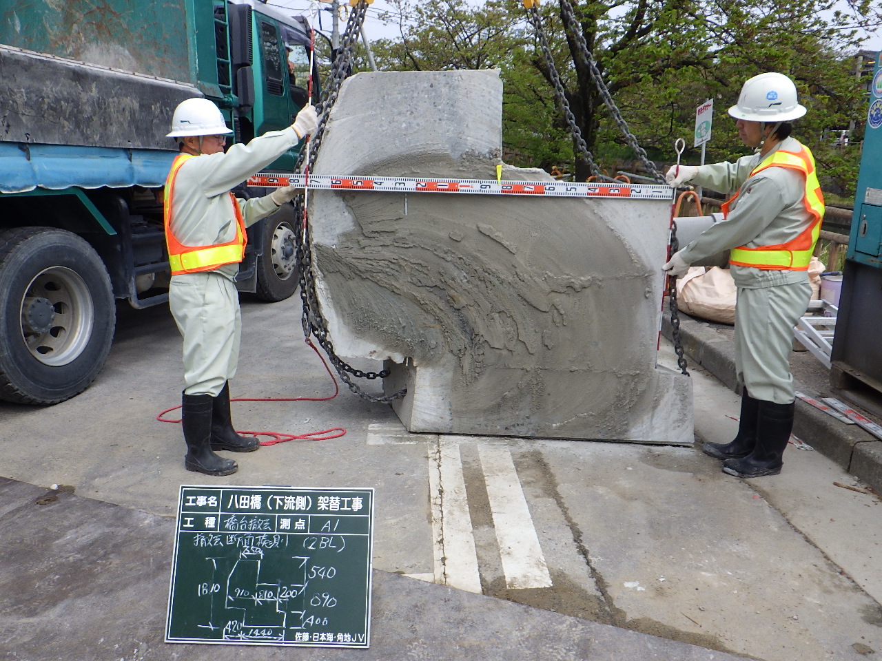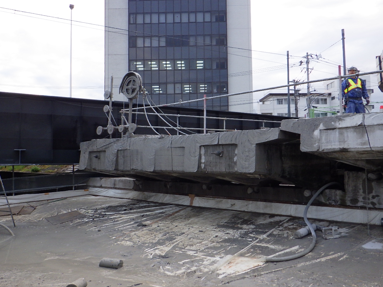 次に旧橋の桁撤去である。A2側はスペース的にクレーンを設置できないため、全てA1側に設置した360tオールテーレンクレーンによって吊りだす方法を採った。既設桁は湿式ワイヤーソーで1ブロック当たり6~10t程度に切断してクレーンで吊りだした。切断によって生じる濁水やガラは、桁下に設置した吊り足場上に養生シートを敷いて水を漏らさないようにし、ポンプで吸い上げて沈殿ろ過して処理した。施工は1か月程度を要している。