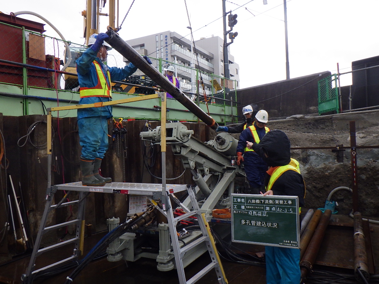 施工はまず、上部工同様の準備工を行った後、基礎杭施工の時に邪魔になるA2側の不明管を撤去し、病院などが存在するA2側に施工時の騒音を抑制するための防音壁を設置した。