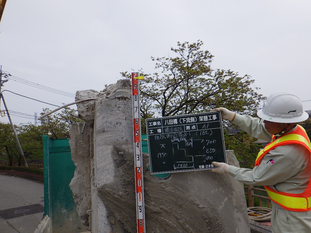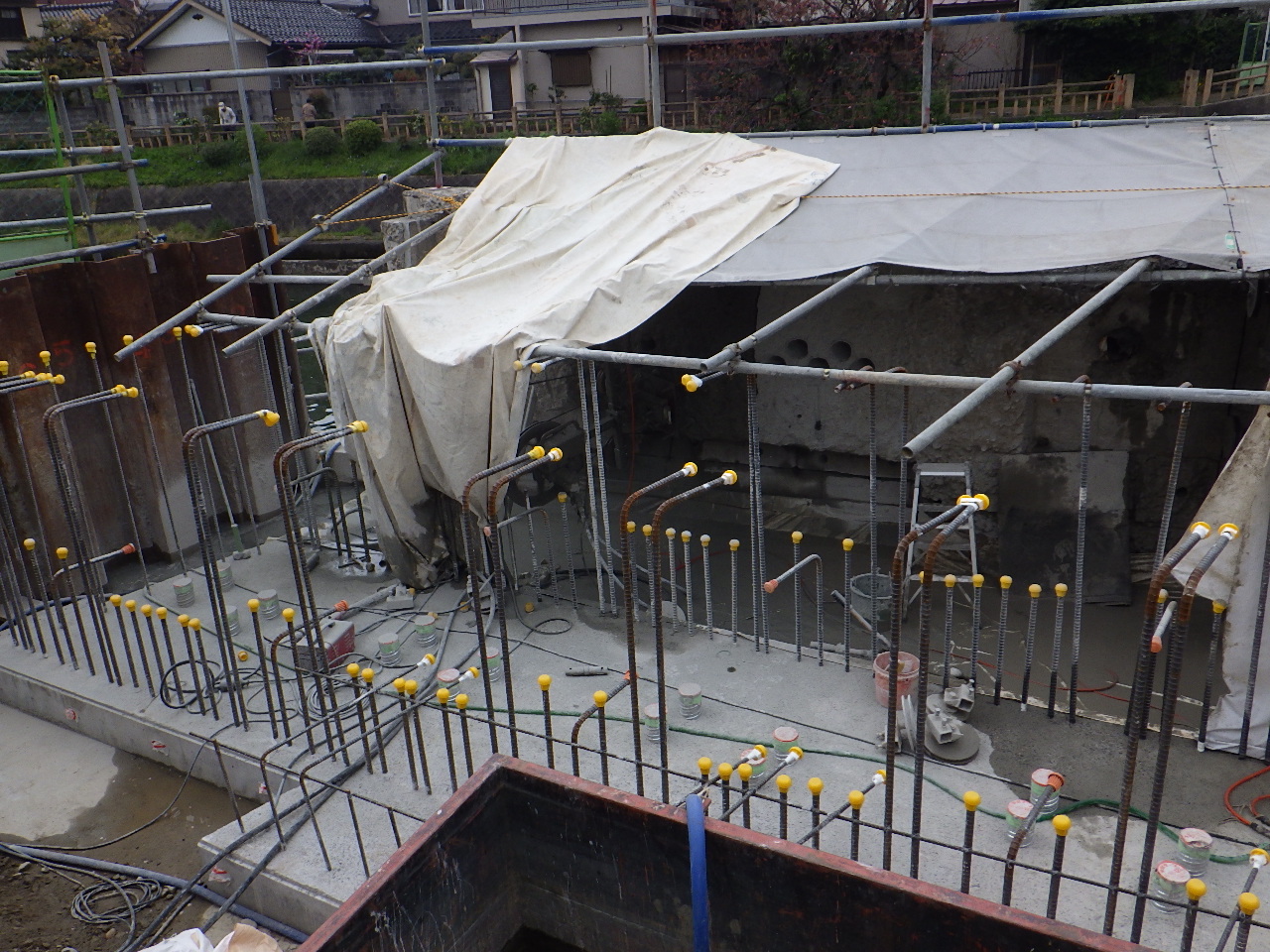 さて、下部工の施工に再び戻る。杭を打設後、杭頭処理する。橋台は高さ4mであるが、まず下部2m部分について、RC構造で杭と接続するための台として先行打設した。上部2m部分は桁と剛結するためのH鋼で作られた支承を組み、その周囲に剛結用の鉄筋を配置する。桁架設前には、新しい橋台よりも河川側にある、架設に干渉しかねない古い橋台の一部をワイヤーソーで切断撤去した。