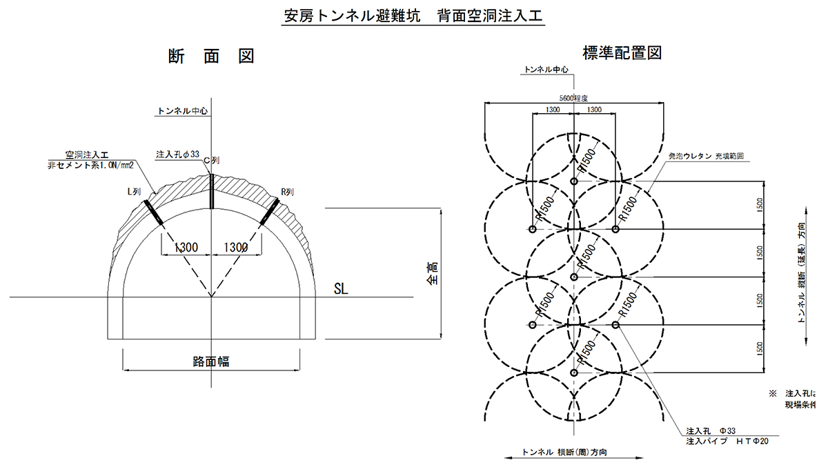 施工延長が長く小断面のため、ウレタンによる空洞注入工法を採用