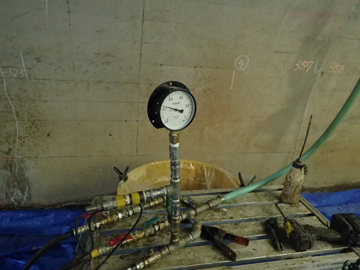 センターは、初期圧力+0.2Mpaでの注入を行い、最後にセンターからウレタンを左右に広げていく形で施工している。注入量は注入ポンプで管理していて、設定量や圧力を打ち込めば自動で止まるようになっている。注入完了後は、注入パイプを覆工面で切断する。
