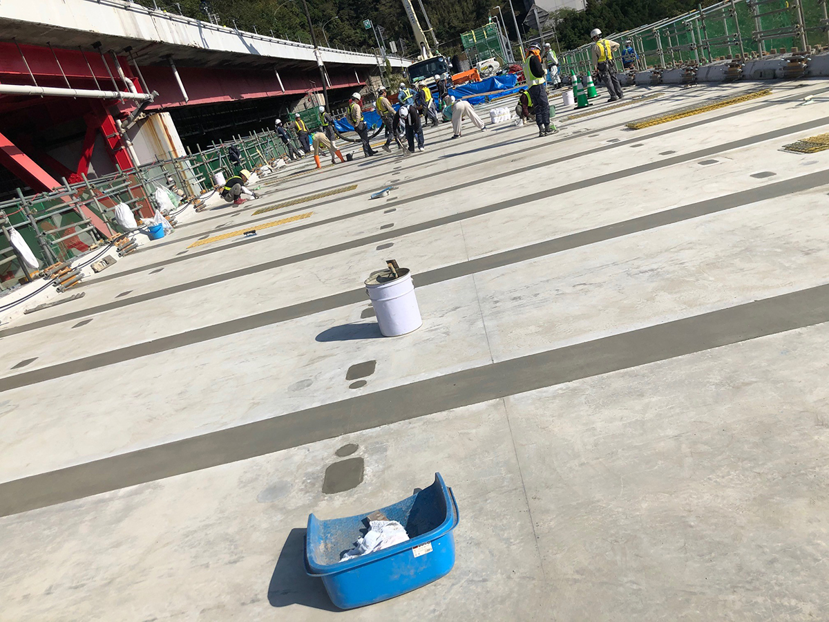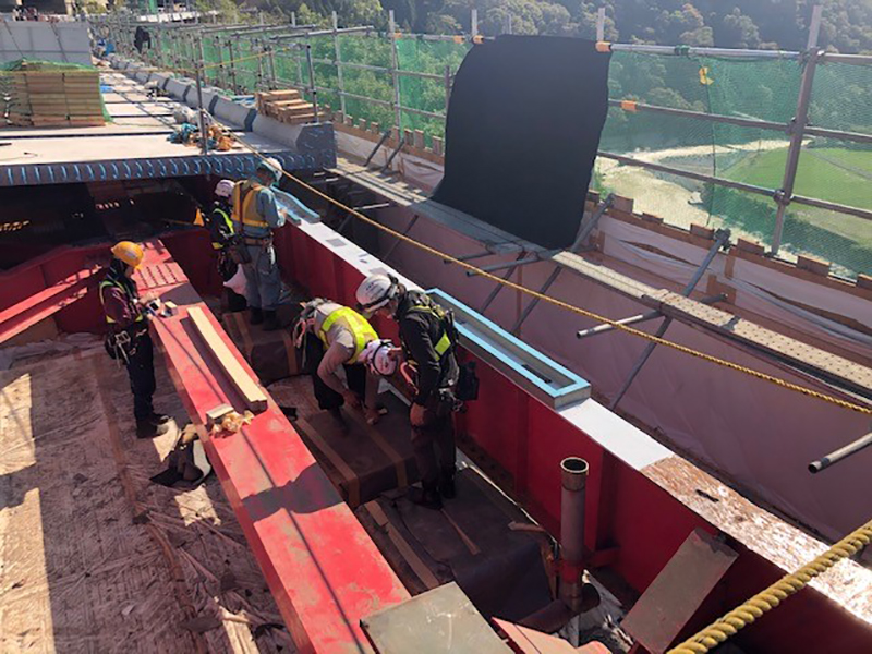 床版防水は高性能床版防水工法(グレードⅡ)を採用し、「レジテクトGS-M工法」で約2,450m2に施工した。舗装は、基層が橋梁レベリング層用混合物(FB13)、表層は高機能舗装Ⅰ型用としている。足場は、パネル吊式足場「SKパネル」を採用している。