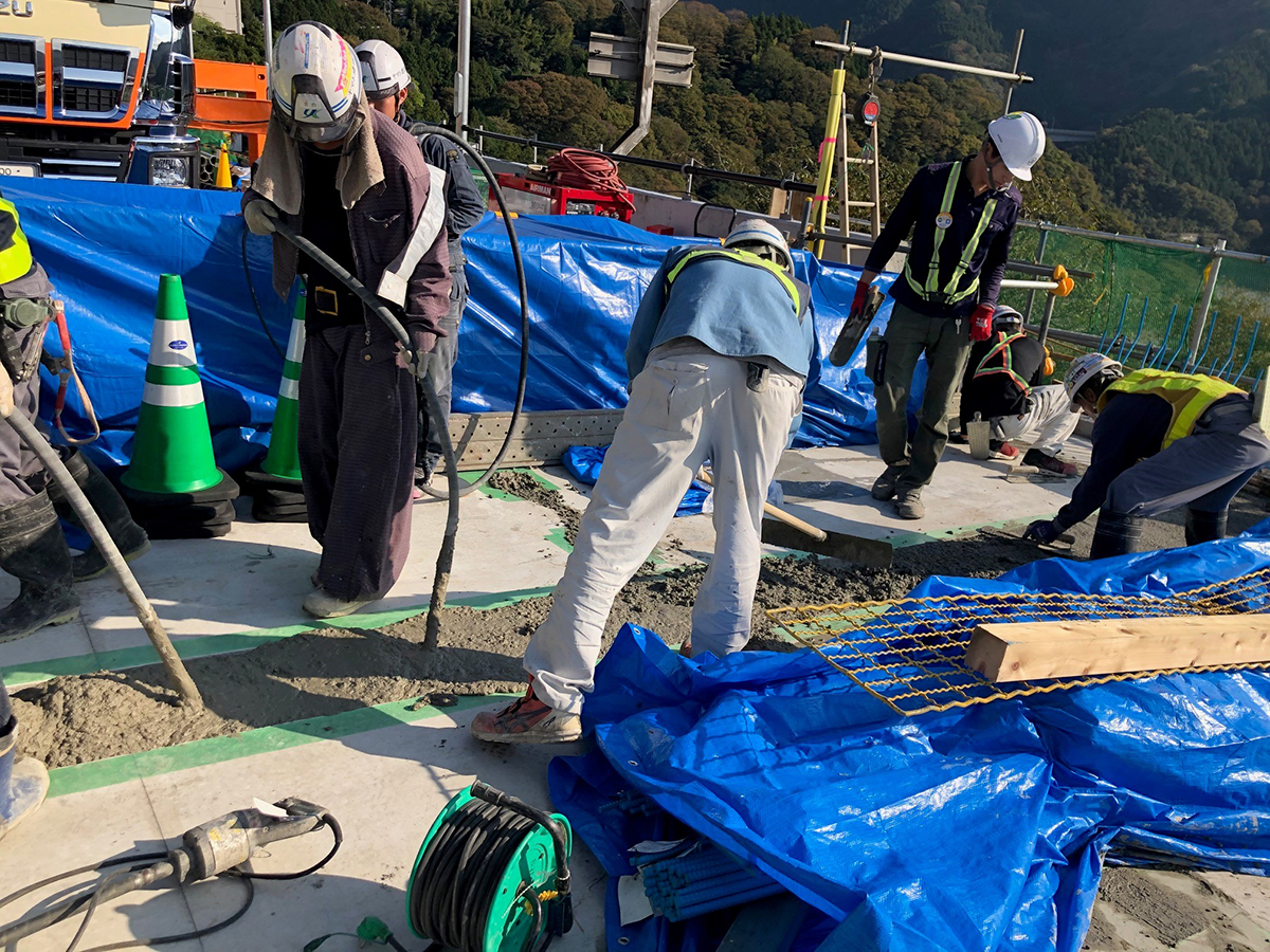 床版継手部はループ継手を採用し、総継手数は105箇所となった。間詰めコンクリートの打設幅は1箇所あたり下幅350mm~上幅390mmで施工している。端部の場所打ち部はP3側が669mm、P6側が655mm(橋軸延長)で、場所打ちを少なくする工夫をした。コンクリートは、早強ポルトランドセメントを用い、強度はプレキャストPC床版と同じ50N/mm2、スランプ12cmとした。打設にあたっては雨天による工程遅延を防ぐために、打設箇所を覆うことができる雨除けテントを用意した。鉄筋は耐食性向上のためにエポキシ樹脂鉄筋を床版内部および場所打ち部すべてに採用している。