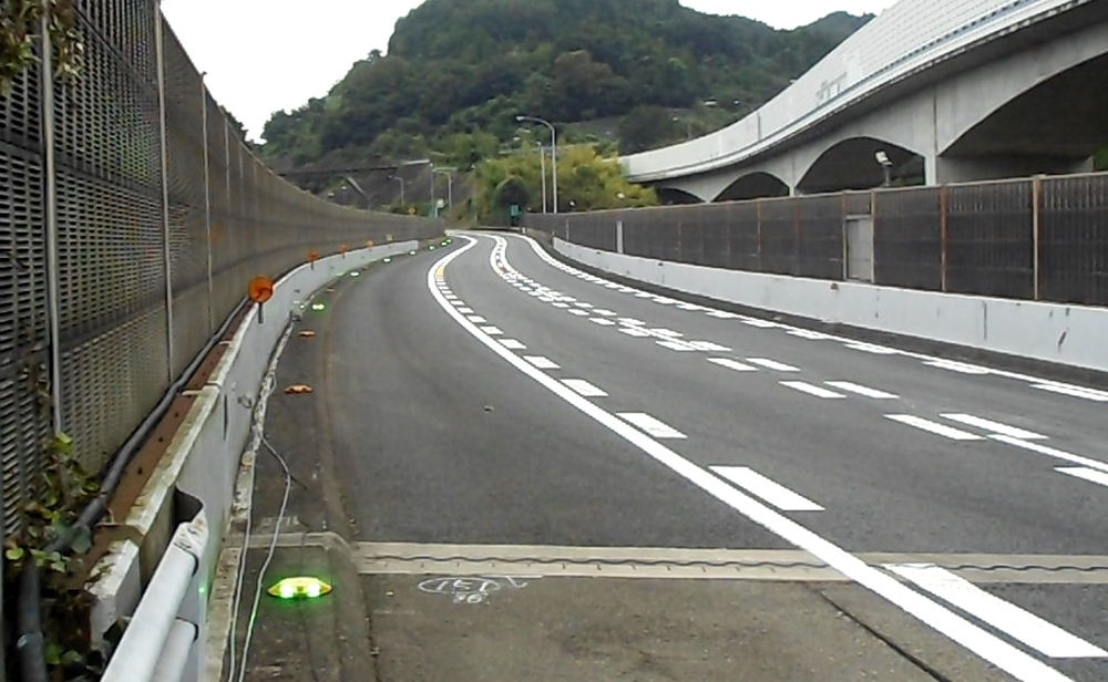 NEXC中日本では利用者への影響を最小化するために情報提供を充実させるとともに、下り線(右ルート)での渋滞ボトルネック対策に取り組んだ。過去の渋滞発生箇所やETC2.0のデータ分析で平均走行速度が落ちている箇所をもとに、渋滞対策箇所を4カ所選定。その区間(合計約7km)の左側路肩に、路面点滅誘導灯「ミチテラ」(大林道路)を設置した。