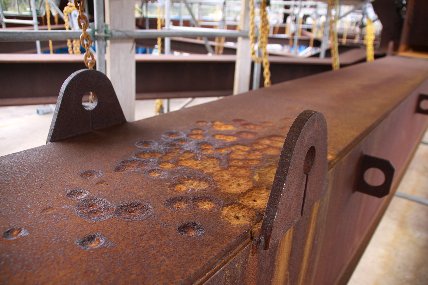 補修は、基本的にブラスト及び塗装、必要な個所は当て板を施す方針である。そこで必要なのは単純にアンカーパターンをつけるだけではなく、塩分を50㎎/㎡未満に抑えることを目標としている。そのため現在はブラスト方法やその量、回数について試験施工している。