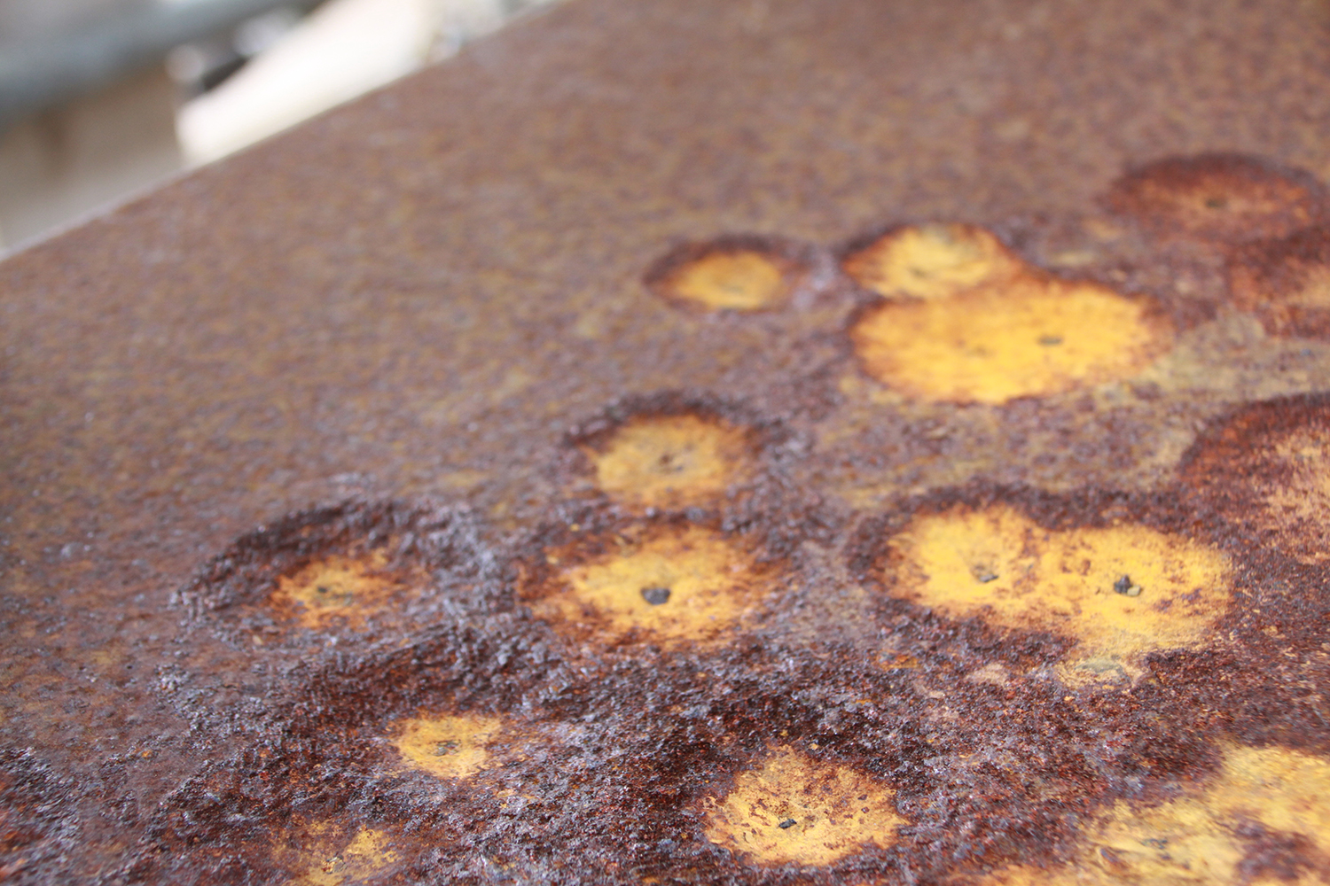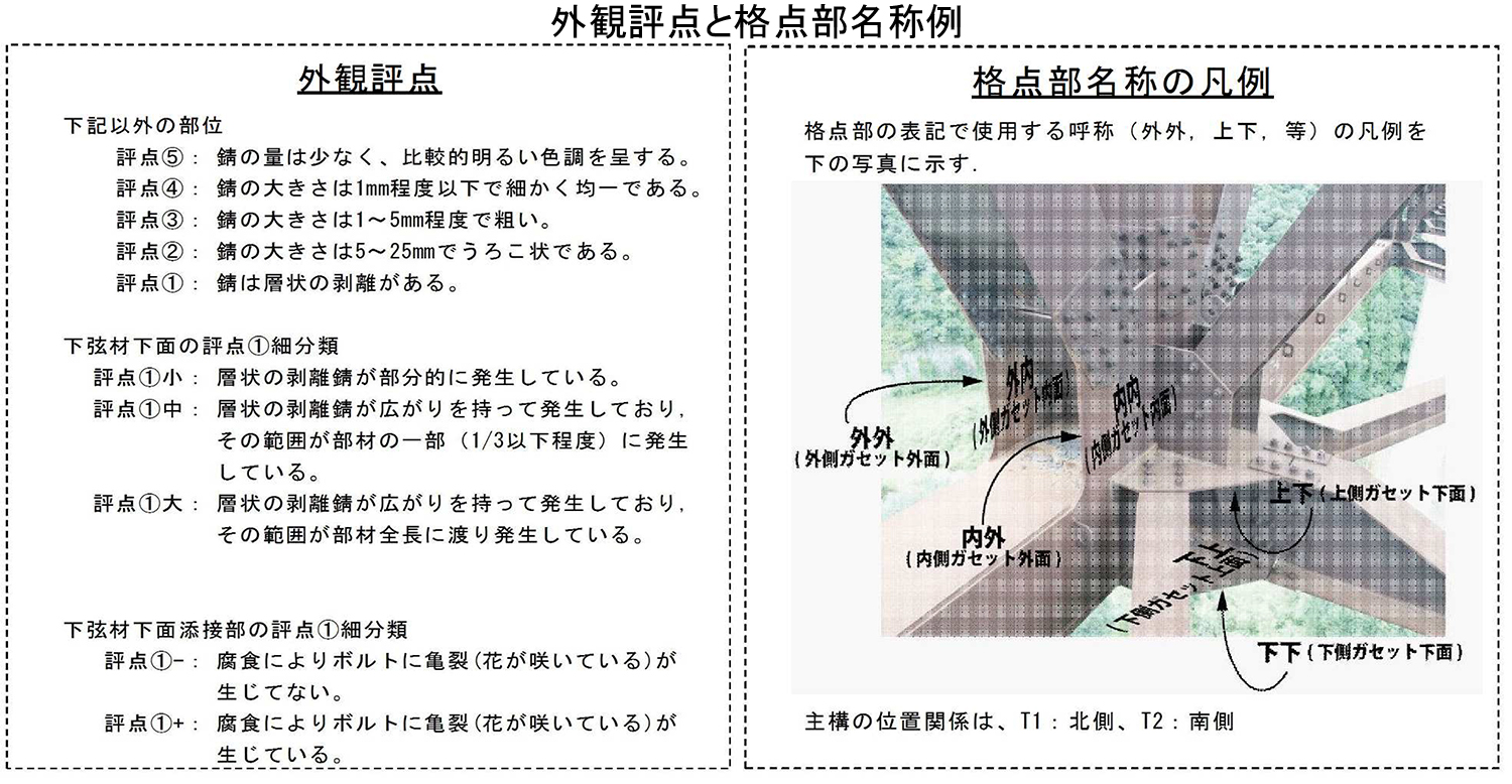 さて、さらに詳しく損傷状況を確認すると、損傷は下弦材下面や下弦材と斜材の格点部や添接部、斜材の一部、そして下弦材の上側の穿ったような損傷に大別できる。それ以外の例えば上弦材には損傷は見られず補修の必要もない。これは降雨による洗浄効果が働いているものと思われる。洗浄効果が働かない下弦材下面は損傷が著しく、塩がたまりやすく流れにくい格点部や添接部も損傷が大きい。また弾着痕のような下弦材上面の損傷は、床版の水抜き穴から滴下した凍結防止剤や塩分交じりの水が長い期間でこうした損傷を作った可能性が大きい。斜材の損傷は上から伝う水の筋に損傷が出ていた。格点部付近のひどい個所は層状錆にとどまらず、孔食が起きている個所も視認できた。北側の下弦材や格点部付近においては、著しく減肉が生じている区間もあった(区間最大で4.6㎜)。