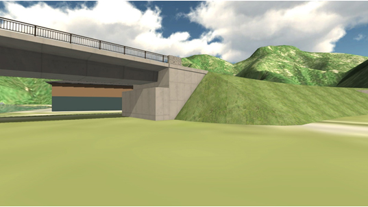 橋梁のプロポーションを引き締め、橋台との床版端部・地覆のラインを合わせて一体感を向上させることを目的に、フェイシアラインを工夫している。茶色のアルミ製防護柵や道路照明・自然石素材の親柱などを用いる予定である。