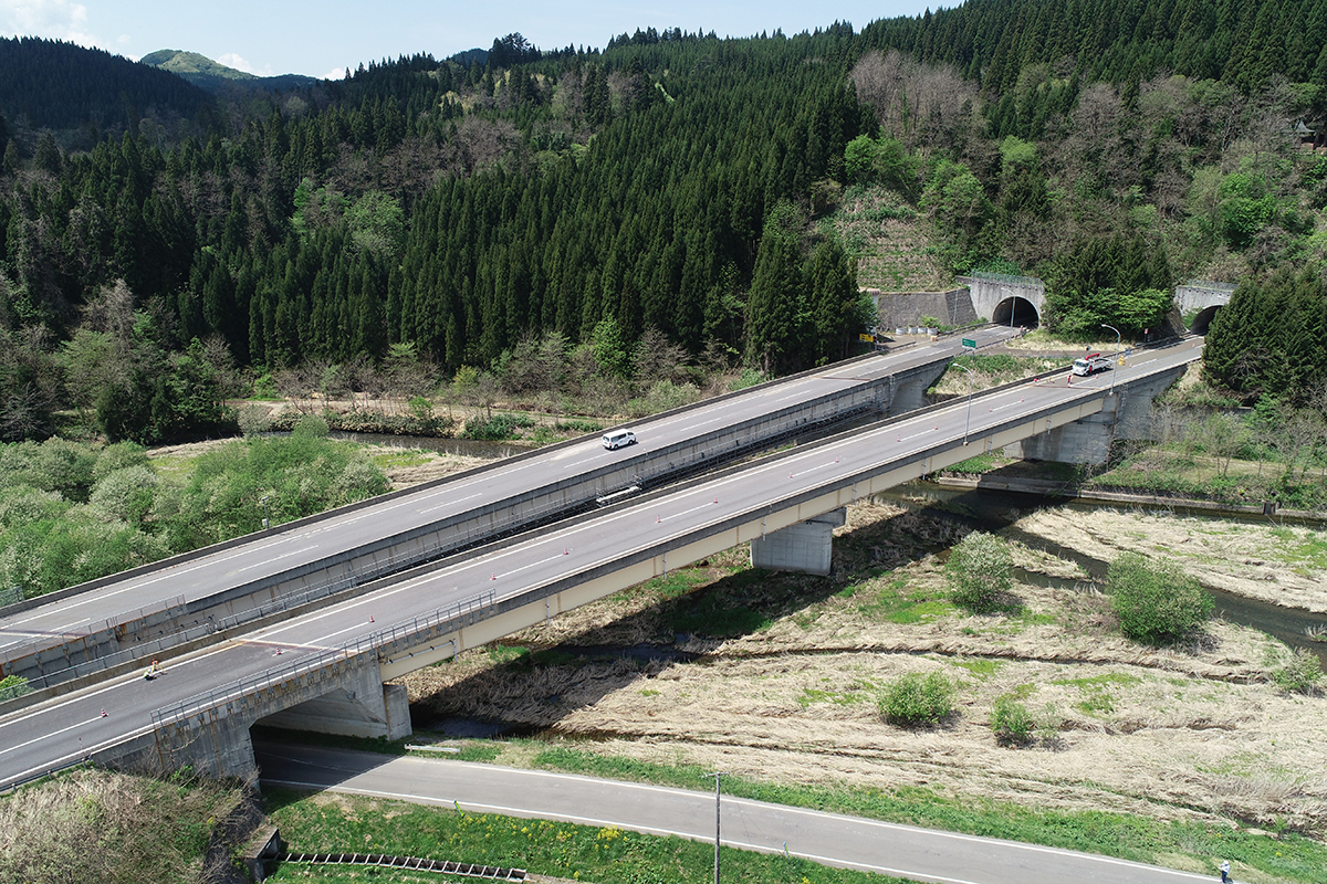 小坂川橋(上り線)は、一級河川小坂川渡河部に架かる橋長117.5m、幅員11.15m(有効幅員9.75m)の鋼2径間連続非合成鈑桁橋。平面線形はR=2,000mで、橋軸勾配0.3%、橋軸直角勾配2%、斜角はA1側(十和田IC側)約49度、A2側(小坂IC側)約50度を有している。十和田IC~小坂IC間上り線の2017年度平均交通量は、約3,400台/日で、大型車混入率は約32%だ。