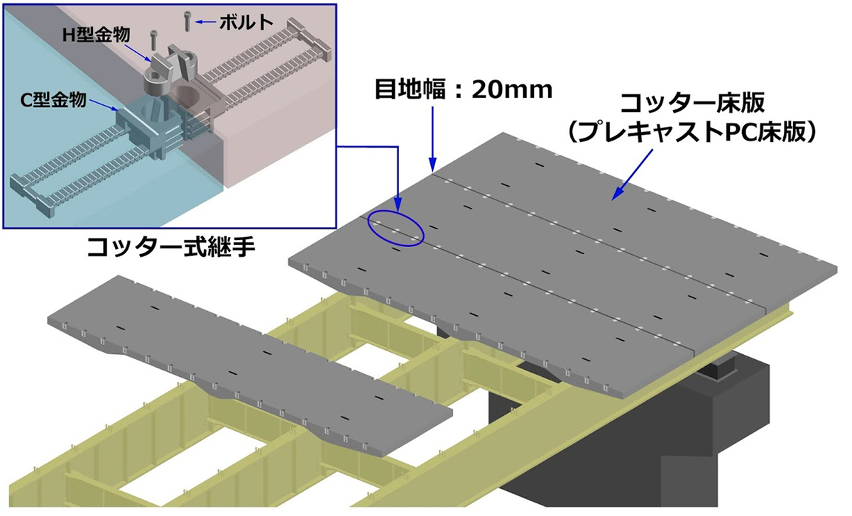 同工法では、プレキャストPC床版に埋設されているC型金物にクサビ状のH型金物を挿入し、固定用ボルトで締め込むことで床版接合を行うコッター式継手を用いる。床版側面に鉄筋の突出がないことから間詰幅を20mmとすることができ、現場でのコンクリート打設が不要となる。そのため、取替床版部分のほぼすべてをプレキャスト化することが可能だ。接合作業はボルトを締め付けるだけなので、熟練工でなくても施工できる。
