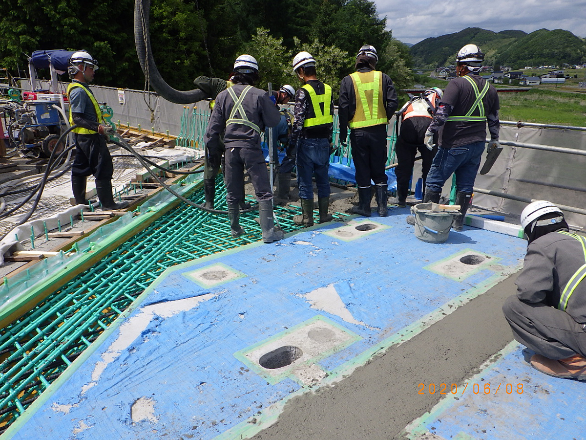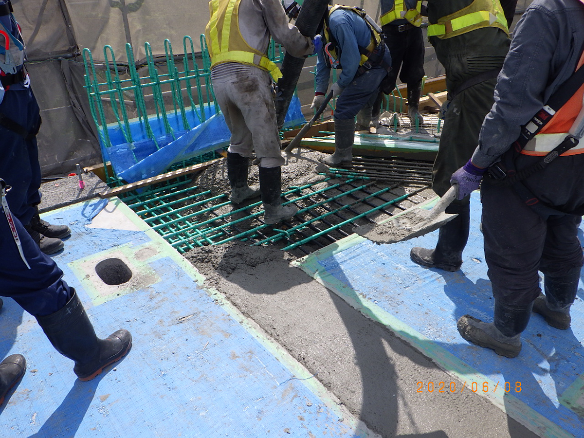 場所打ち部は、「最大限にプレキャスト化を行った」(NEXCO東日本)ために、斜角を有しているA1とA2側端部のみで、その面積は合計で約8.0m2だった。場所打ちコンクリートは、高強度コンクリートを用い、強度はプレキャストPC床版と同じ50N/mm2、スランプ12cmとした。