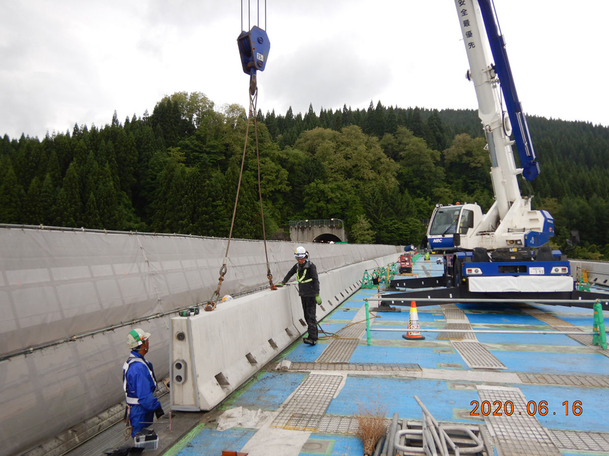 壁高欄はプレキャスト壁高欄であるプレキャスト・ガードフェンス(PGF)を両側に採用した。施工は床版設置し、A2伸縮装置設置後、乗込構台を構築して並行して施工した。6月11日に開始し、25t吊ラフタークレーンで標準サイズ4.4mのブロックを1日あたり30m設置していき、25日に完了させた。