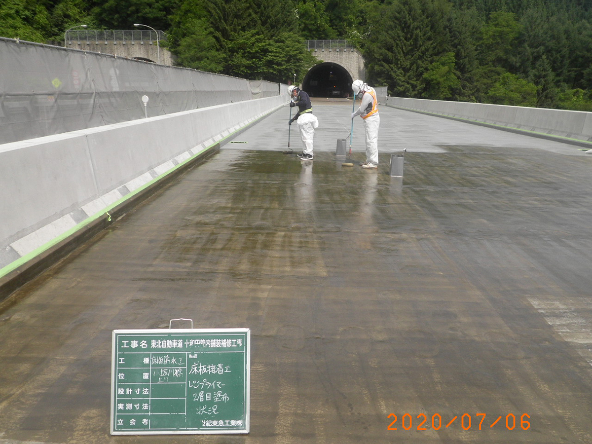 床版防水は高性能床版防水工法(グレードⅡ)を採用し、1,100m2を6日間かけて施工した。舗装は、基層が橋梁レベリング層用混合物(FB13)、表層は高機能舗装Ⅱ型用混合物で、基層1日、表層1日の2日間で完了している。