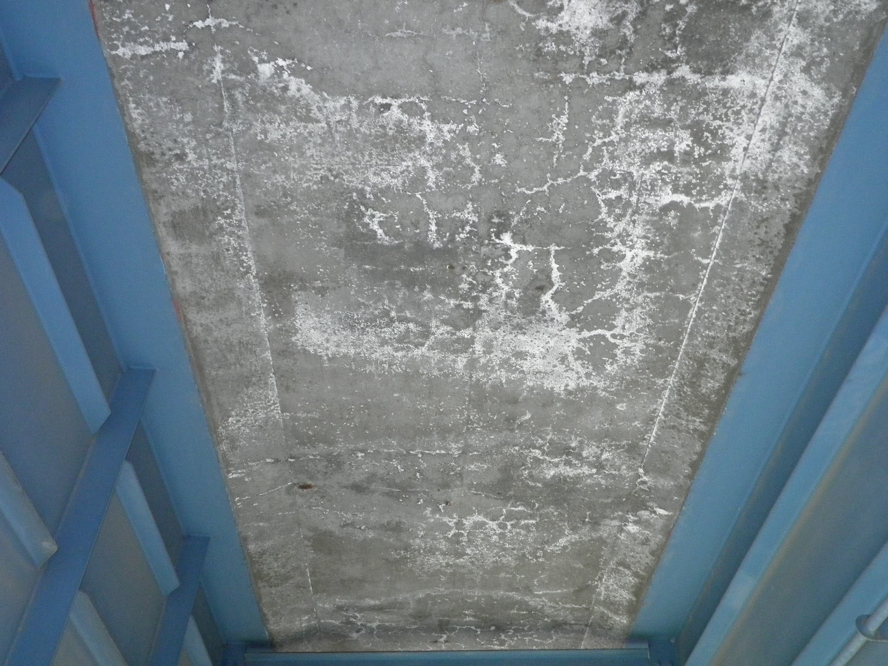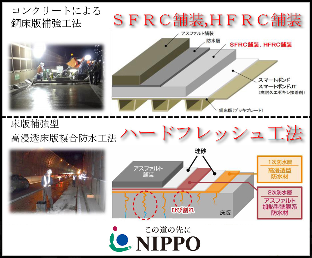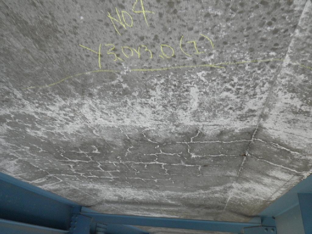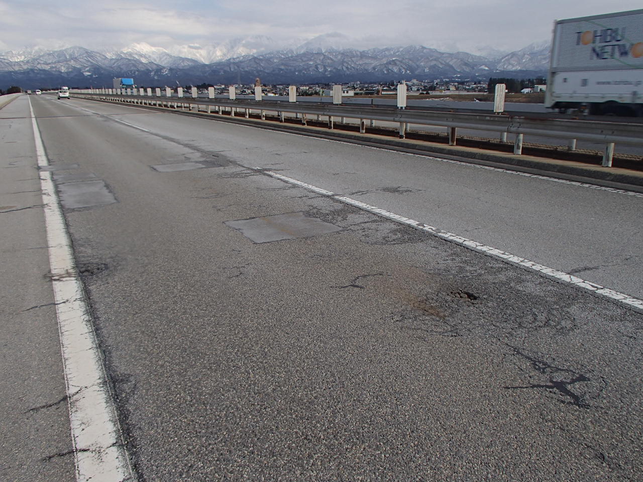 同橋は、他の北陸道の大規模リニューアル対象橋梁と同様に凍結防止剤の影響と見られる損傷が散見されている。床版上面では、凍結防止剤による塩害が生じており、表面の塩化物イオン量は4kg/m3の値を示した。その影響によりかぶりコンクリートの浮き、剥離により、舗装路面にポットホールの発生が生じている。床版下面では、床版上面から塩化物イオンを含んだ水が床版に生じたひび割れより浸透し、床版下面にエフロレッセンスの析出やコンクリートの浮きが生じている状況にある。床版以外で特に損傷が顕著なのが、ジョイント部や桁端部と床版張出し部の漏水に起因する劣化だ。特に張出し部は凍結防止剤の巻き上げによって山側海側のフランジ上面に塩分が溜まって、劣化を助長しているような状態にある。