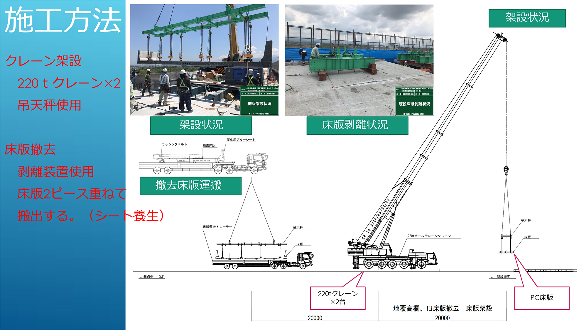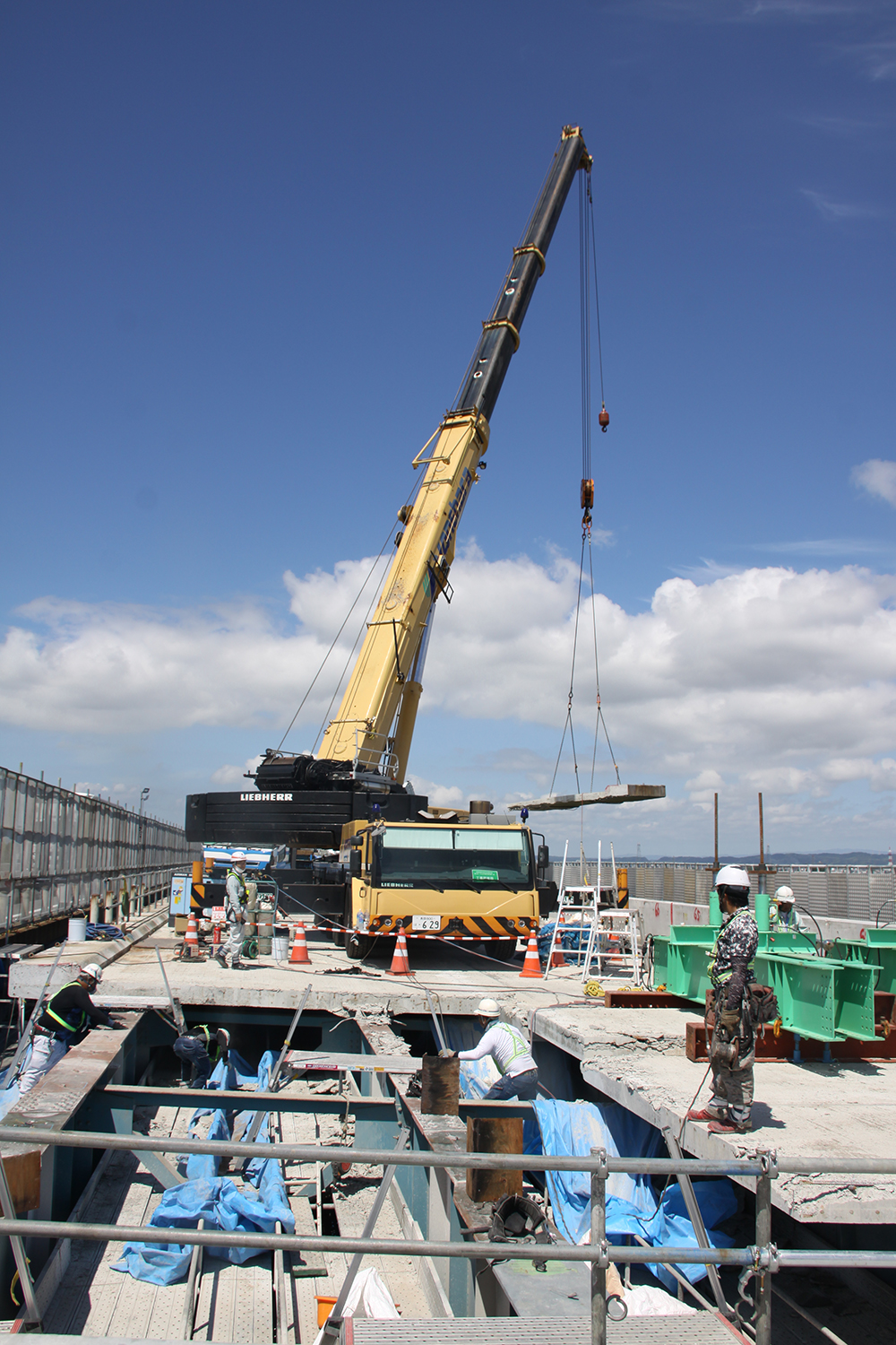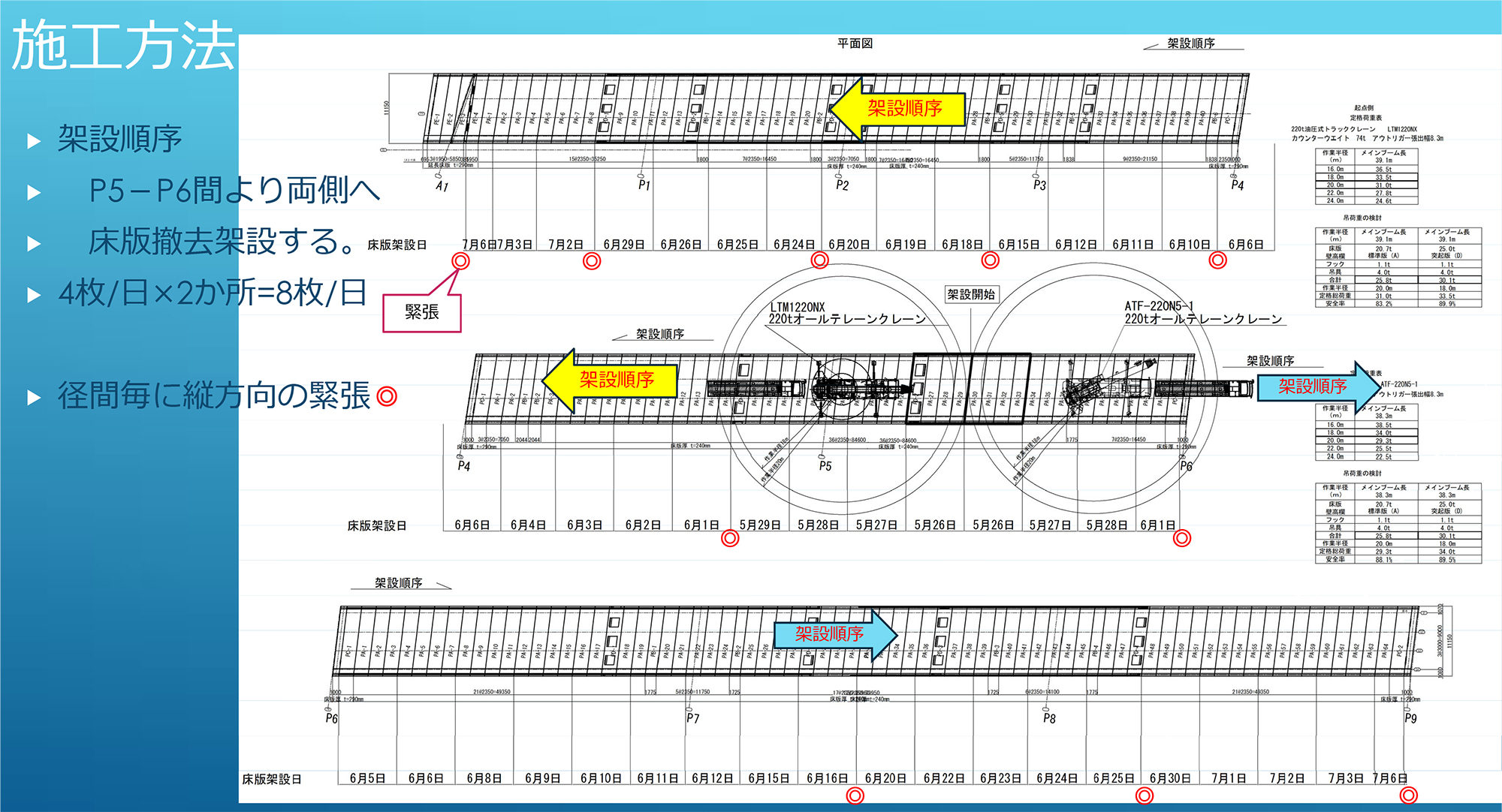 撤去床版は地覆付きが1枚当たり(橋軸)2m×(橋軸直角)5.825mで8.5t、壁高欄付きが2m×6.075mで9t。新設床版は2.35m×11.150mで約20t。P5-P6中間部を境として両側に220tオールテーレンクレーンを1台ずつ配置し、1日に10~20枚既設床版を撤去して、4~8枚新設床版を設置していく。