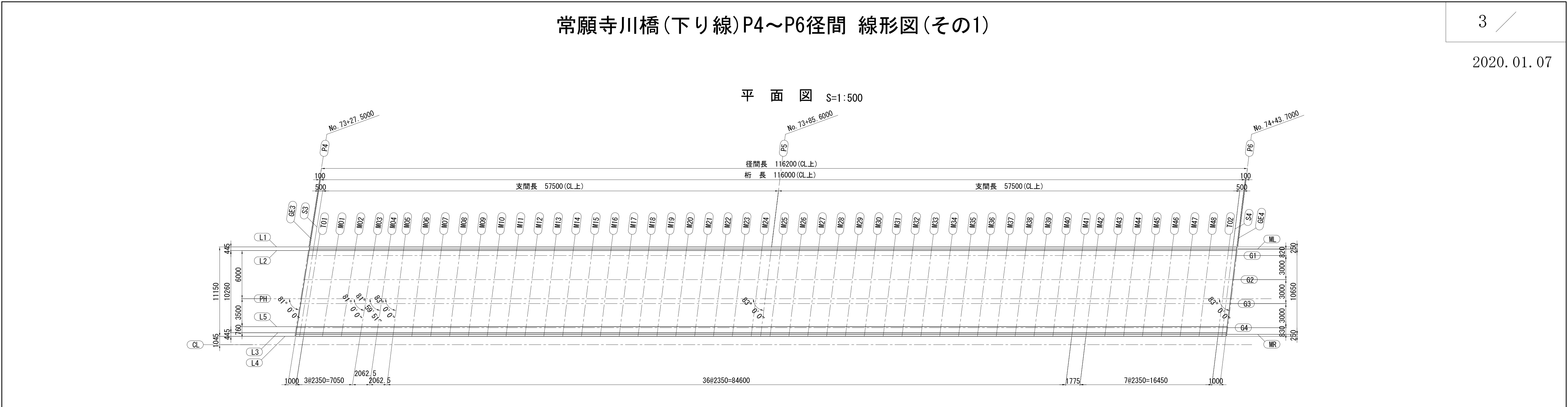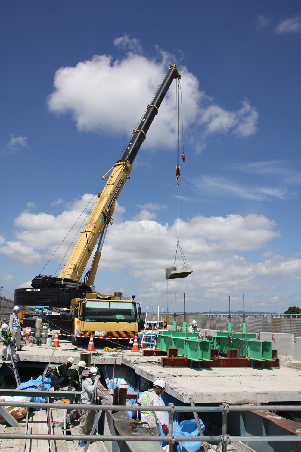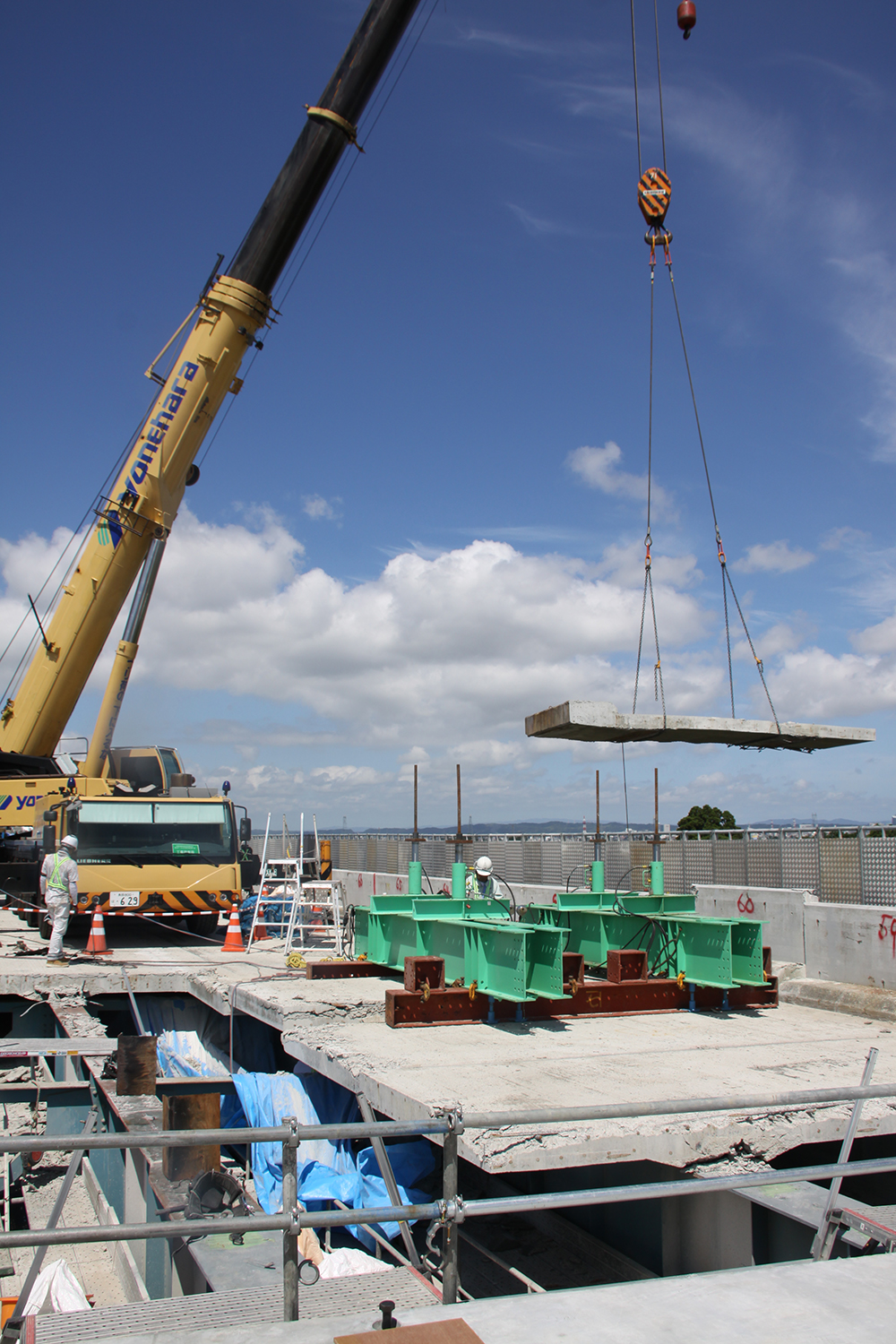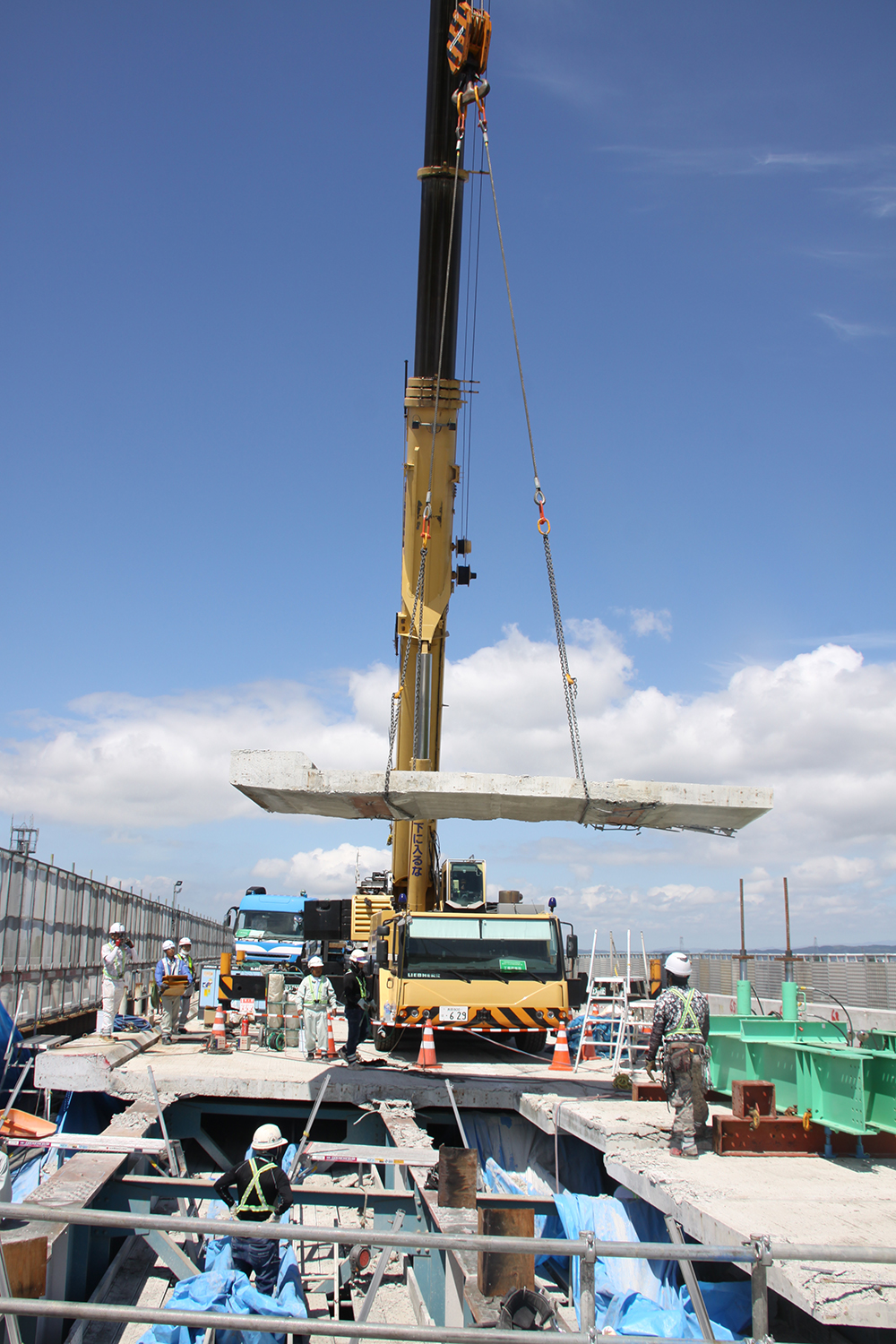 撤去床版は地覆付きが1枚当たり(橋軸)2m×(橋軸直角)5.825mで8.5t、壁高欄付きが2m×6.075mで9t。新設床版は2.35m×11.150mで約20t。P5-P6中間部を境として両側に220tオールテーレンクレーンを1台ずつ配置し、1日に10~20枚既設床版を撤去して、4~8枚新設床版を設置していく。