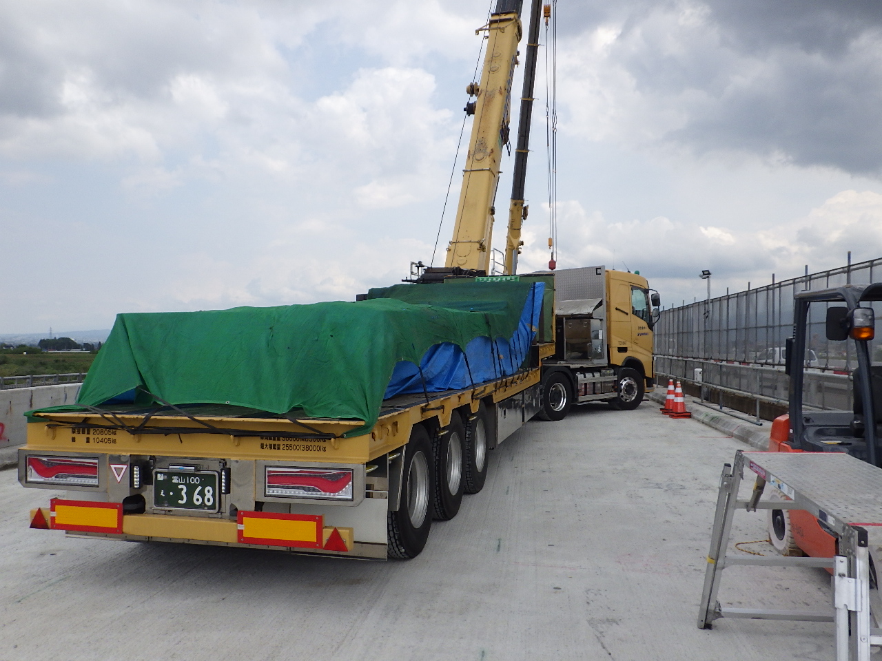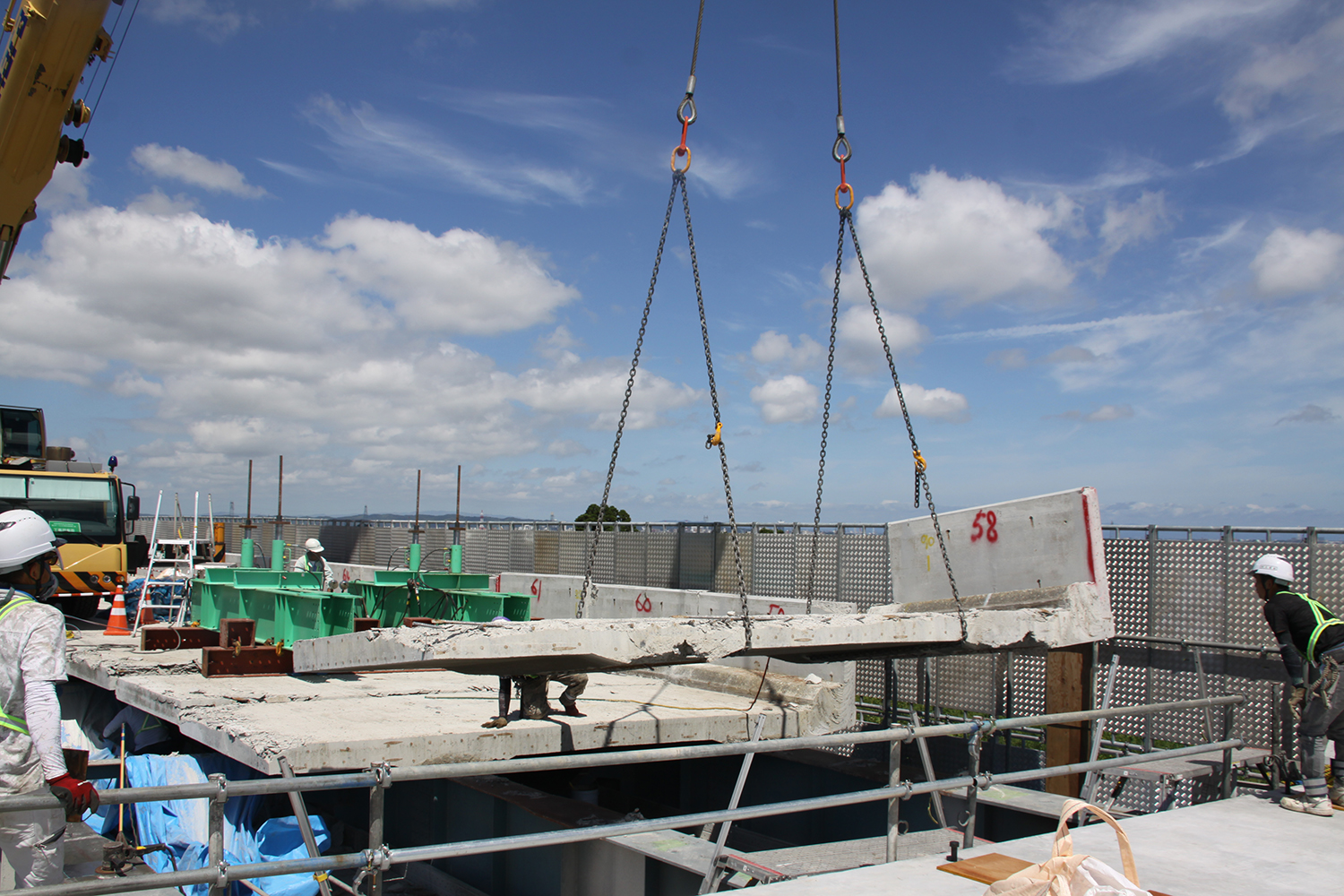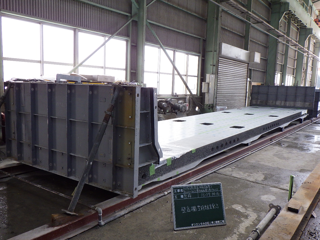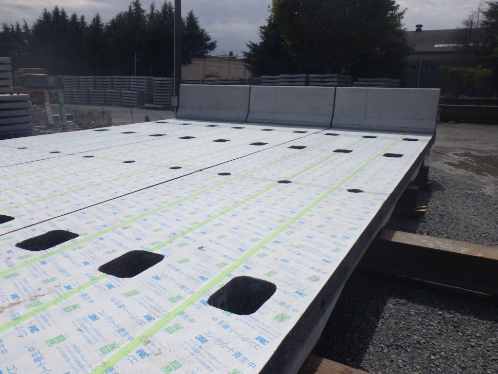 床版は元請であるオリエンタル白石の関東工場(真岡市)で製作し壁高欄一体化とした。床版の長期耐久性をより向上させるため3Mシートを表裏両面に張って封緘養生した。打設した翌朝迄は蒸気養生し、その後は場外ヤードに出して3Mシートを張ってシートをかけて養生するもの。製作した床版は、毎日4~8パネルを現場に陸送した。陸送には24t積トレーラーを用いた。