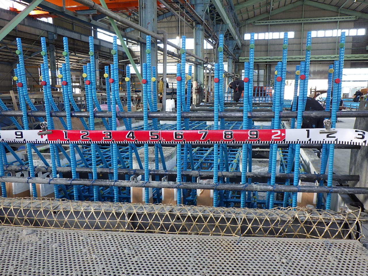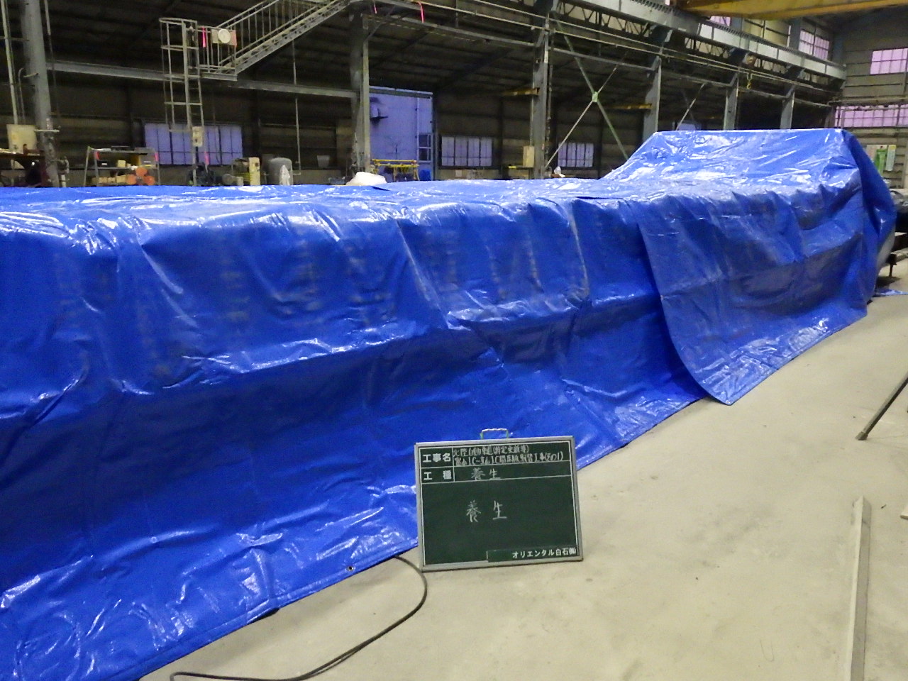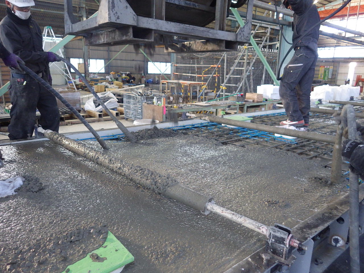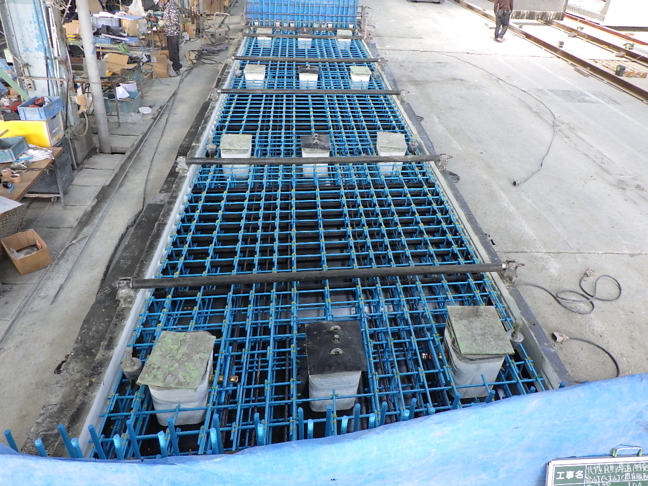 床版は元請であるオリエンタル白石の関東工場(真岡市)で製作し壁高欄一体化とした。床版の長期耐久性をより向上させるため3Mシートを表裏両面に張って封緘養生した。打設した翌朝迄は蒸気養生し、その後は場外ヤードに出して3Mシートを張ってシートをかけて養生するもの。製作した床版は、毎日4~8パネルを現場に陸送した。陸送には24t積トレーラーを用いた。