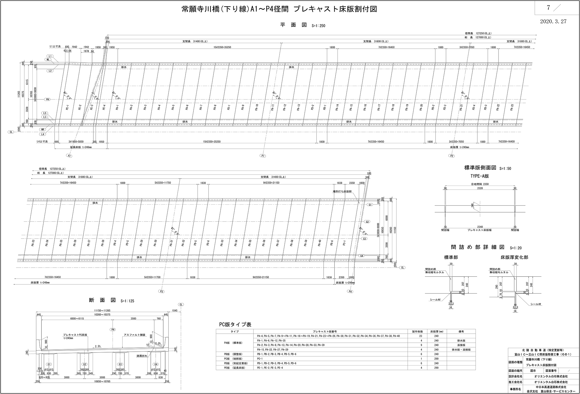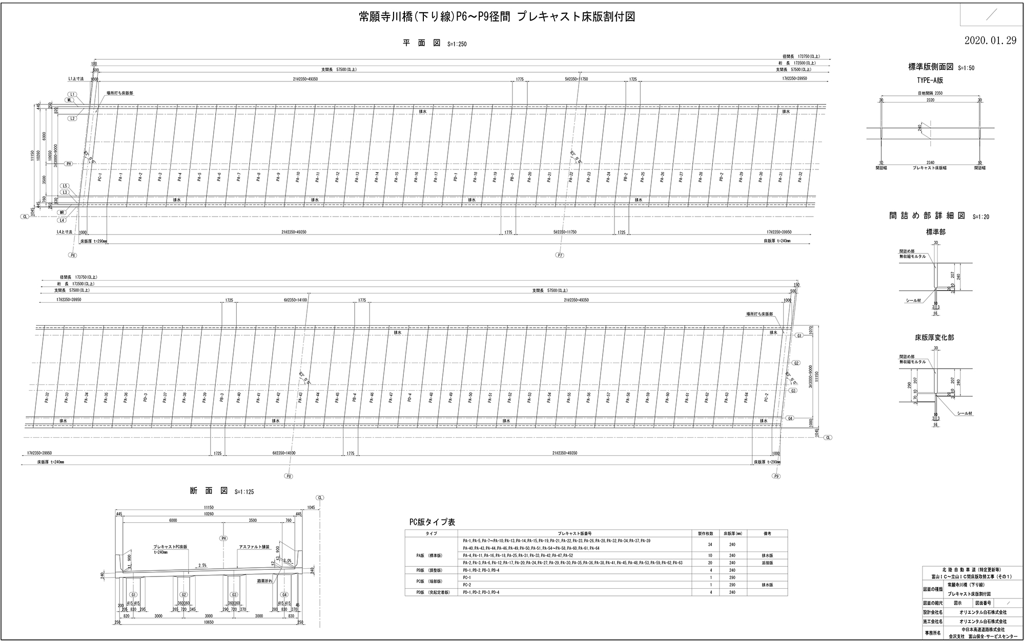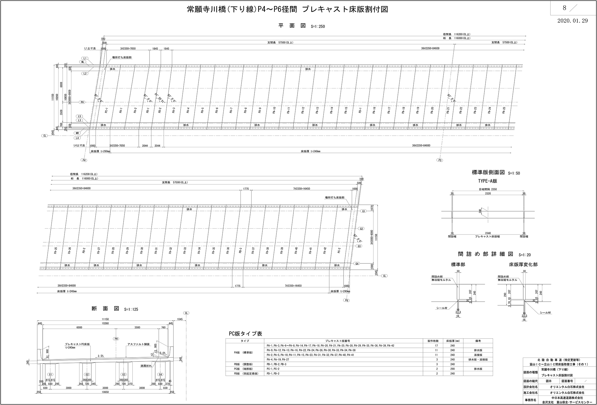 同橋のPCaPC床版は全部で410枚撤去し、176枚配置した。新設パネルの内訳はプレキャストPC床版が176枚、延長床版が4枚という構成だ。延長床版はA1側に配置した。床版厚は標準版が240mm、突起版が240mm+突起部最大280mm、斜角調整版や端部版が最大290mmとなっている。
