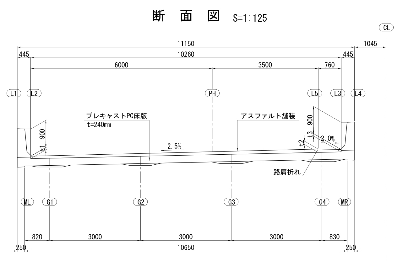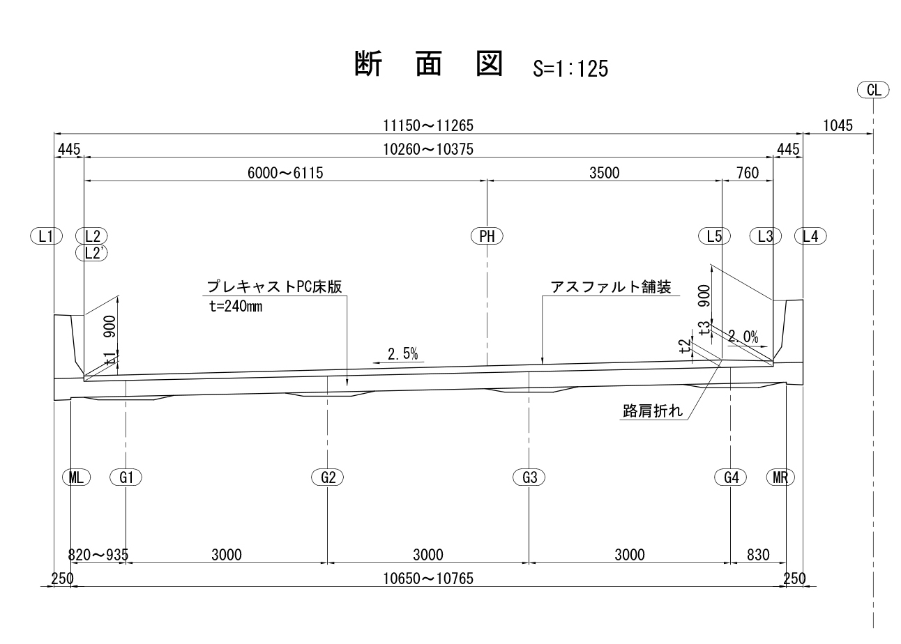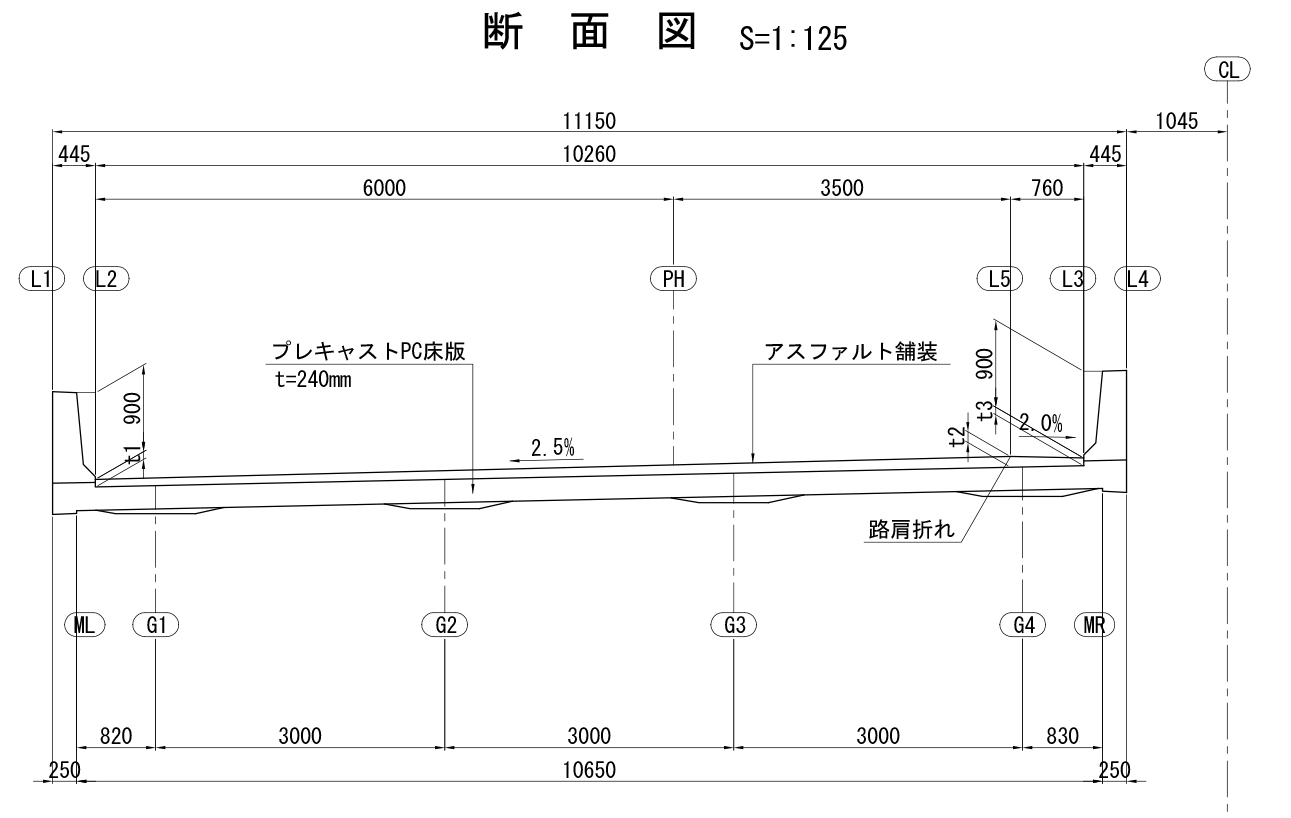 同橋のPCaPC床版は全部で410枚撤去し、176枚配置した。新設パネルの内訳はプレキャストPC床版が176枚、延長床版が4枚という構成だ。延長床版はA1側に配置した。床版厚は標準版が240mm、突起版が240mm+突起部最大280mm、斜角調整版や端部版が最大290mmとなっている。