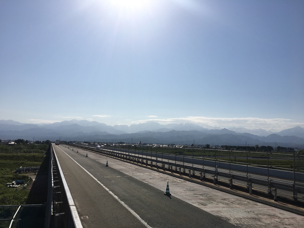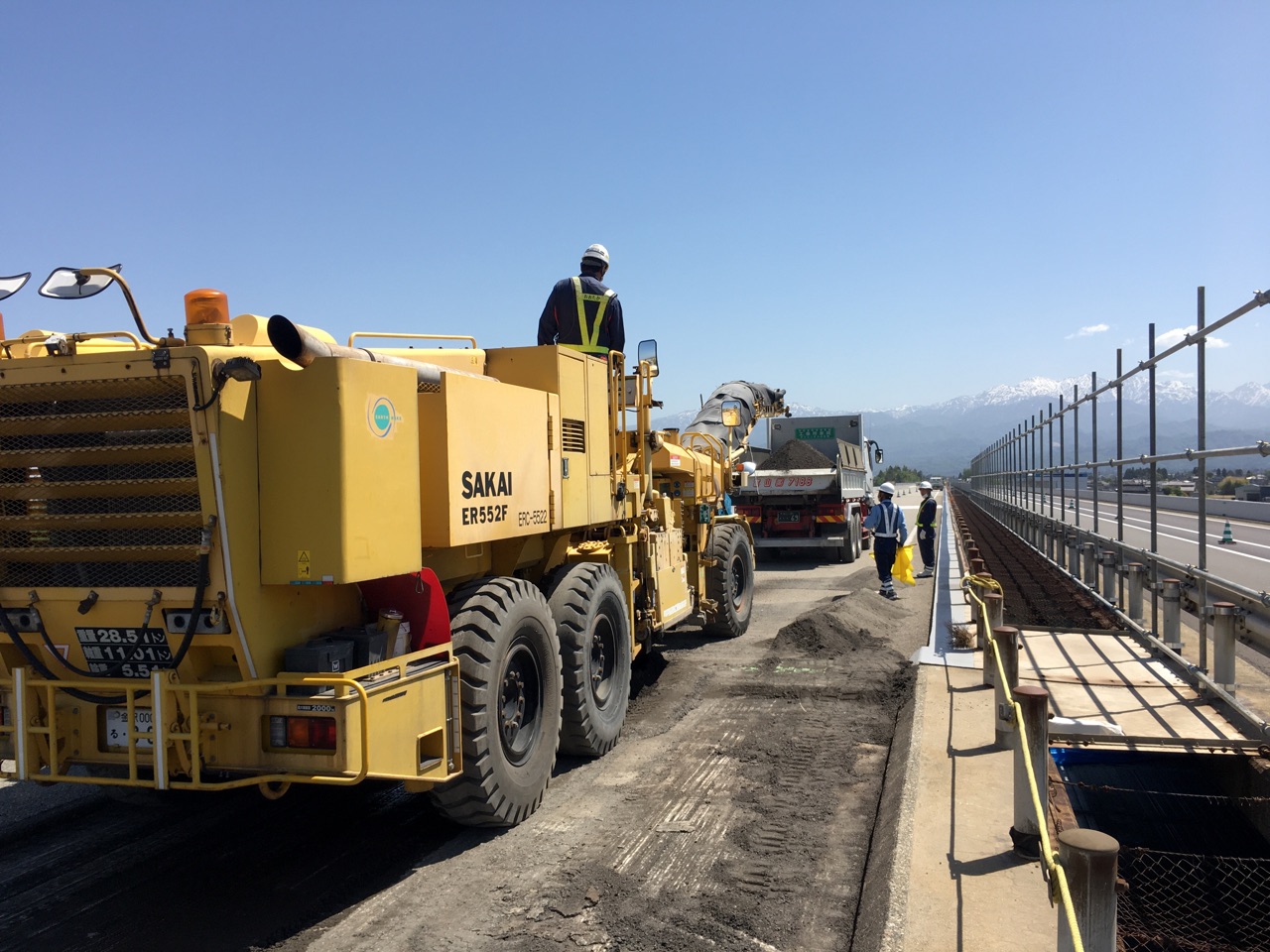 今回取替えるのは、常願寺川橋(下り線の)A1~P9間(橋長417.6m)の床版4956.4㎡である。5月22日から7月28日までの68日間、下り線を通行止めにして上り線を用いた対面通行規制にして施工した。完全な対面通行区間は2.65㎞、渡り線も含めると規制区間の総延長は3.65㎞となる。
