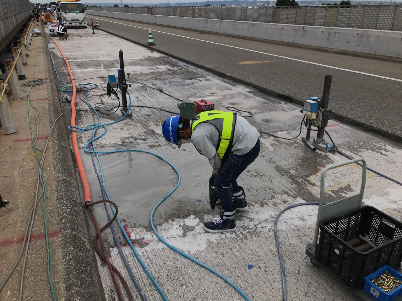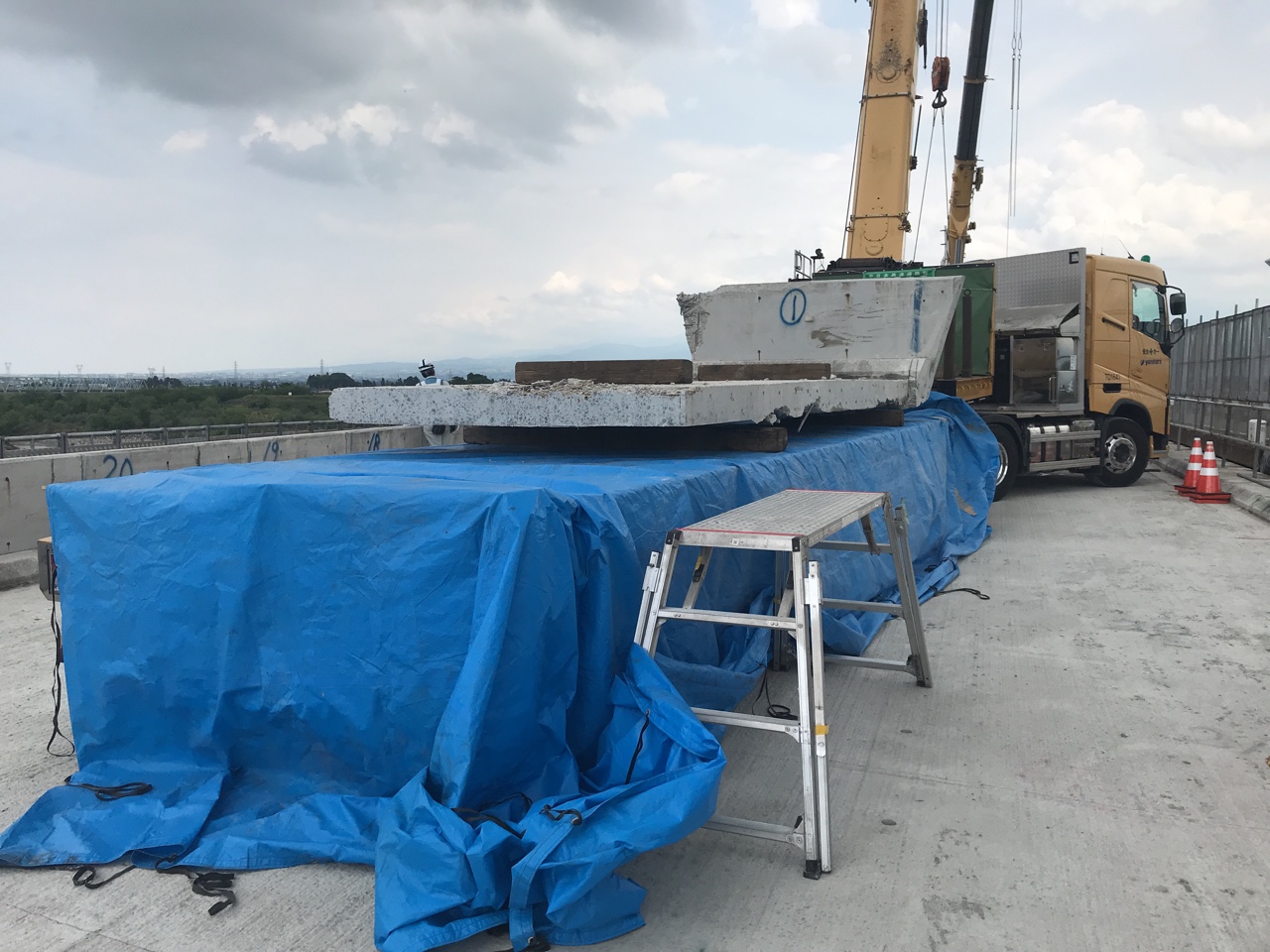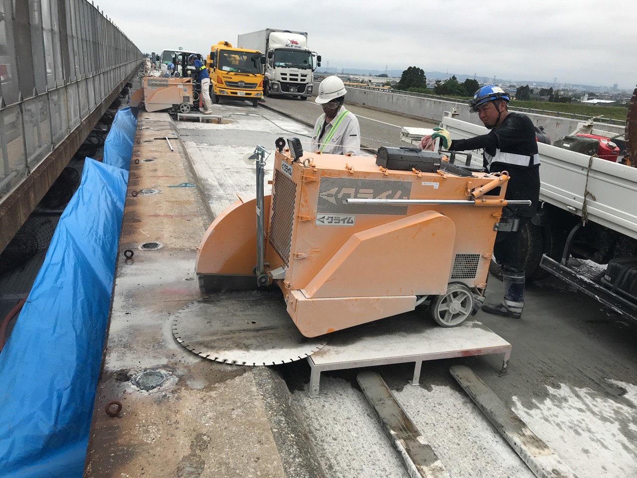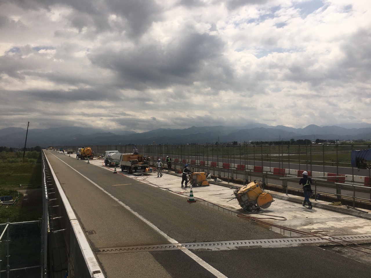 その後は、すぐに測量を行い、カッターラインを出して削孔やカッター切断を行った。対面通行に切り替わった後はすぐに残った半分について路面切削を行い、カッター、コア、ワイヤーソーによる切断を開始した。7月28日には、お盆を含む繁忙期を迎えるため一旦、対面通行規制を解除する必要がある。そのため床版防水工は行わず仮舗装を施工し、工事を止めて供用した。この後、8月下旬から11月上旬にかけて仮舗装切削、A1延長床版工の施工、床版防水工、舗装工や路面標示などを行って完成となる。前半戦は68日の規制日数内に176枚のパネルを全部設置しなければいけない非常にタイトなスケジュールとなる。