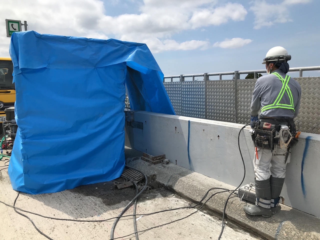 2日間かけて追越車線側の全延長の舗装を切削した。切削と同時に仮設防護柵の設置、転落防止網の撤去も行った。舗装切削は初日に入口側半断面、2日目に出口側半断面の施工を行っているが、その他の撤去・仮設工は舗装切削と干渉しないように施工している。