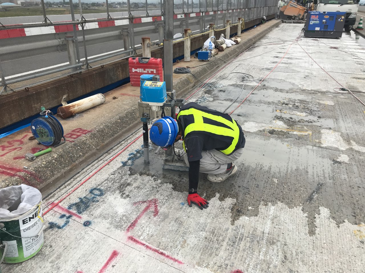 追い越し車線規制中の路面切削、コア削孔、床版カッター切断状況