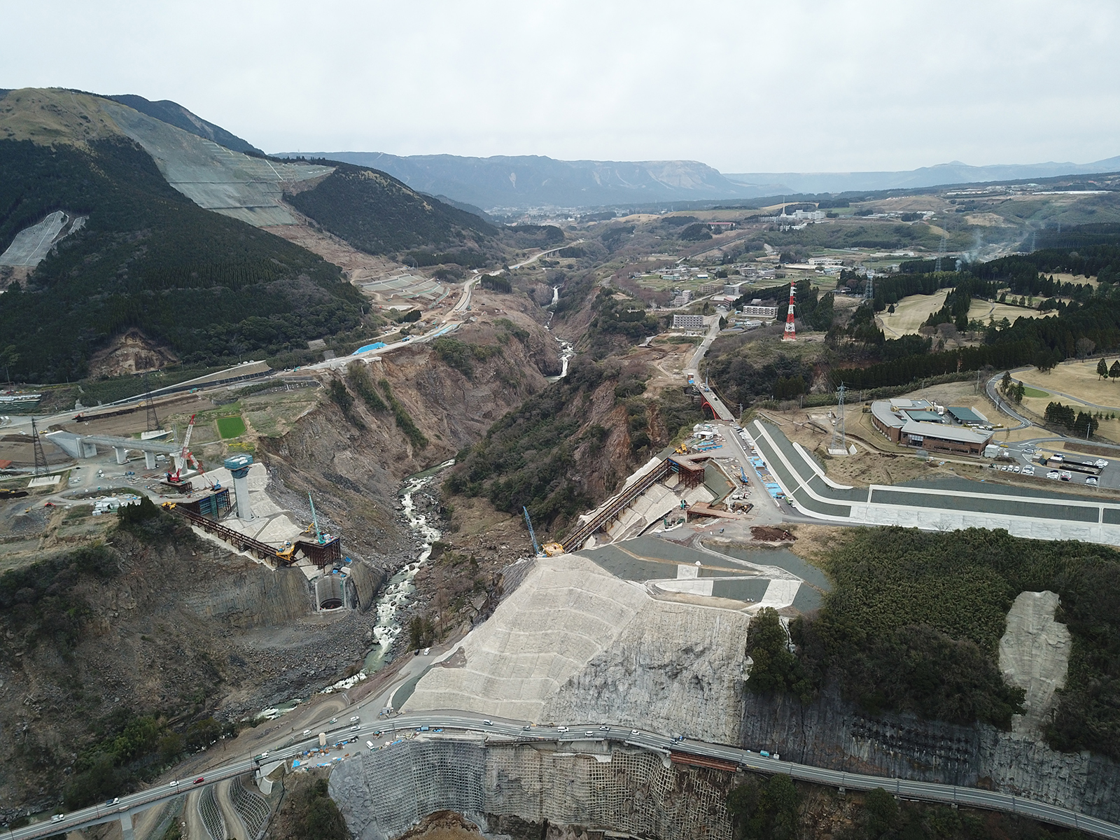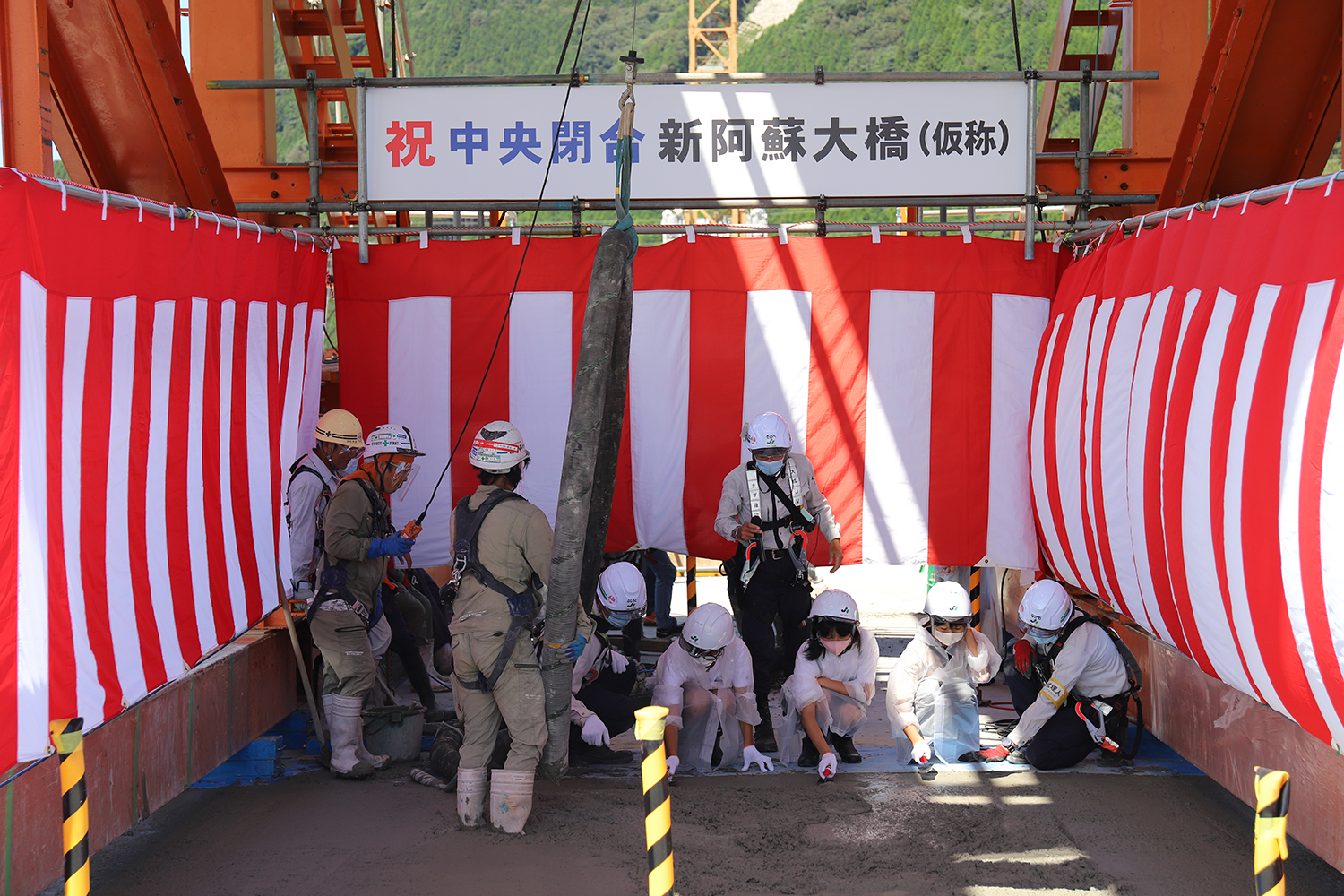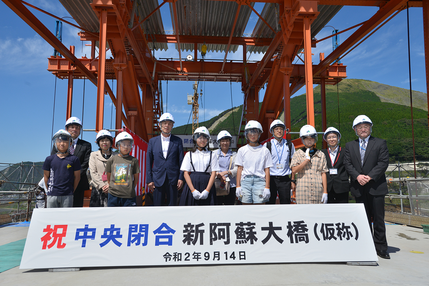 同事務所の大榎謙所長は閉合を迎えて、「晴天の下で無事、中央閉合を終え、新しい阿蘇大橋の橋桁が1つに繋がりました。最終ブロックのコンクリート打設を手伝って頂いた地元小学校の生徒さんからは「ひとつひとつが人の手でできていることに感動した」、「完成したら家族と渡りたい」、「(橋から見た景色を見て)改めてふるさと阿蘇の美しさを感じた」等の心温まるコメントを頂きました。地形・気象等、施工条件が厳しいなか24時間体制で施工が進められてきたわけですが、工事が予定通り進んでいることは工事関係者の方々の不断の努力と、関係各位のご理解・ご協力の賜物に他なりません。本当に感謝の念に堪えません。本橋は令和3年(2021年)3月頃の供用を予定していますが、引き続き、1日でも早く皆さんに利用していただけるよう職員一同全力で頑張ってまいります」と述べた。