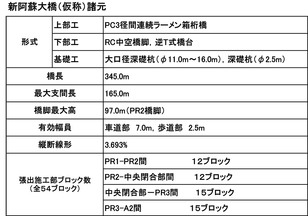 架け替え中の阿蘇大橋は、アプローチ部が鋼3径間連続鈑桁橋(橋長115m)+鋼単純箱桁橋(橋長65m)。今回剛結した渡河部は橋長345mのPC3径間連続ラーメン箱桁橋で、最大支間長は165m(PR2~PR3間)となっている。元の阿蘇大橋と比べて、黒川を600mほど下流に下った位置に架け替えられている。アプローチ部も含めると崩落した旧阿蘇大橋よりも300mほど長い橋長となっている。橋梁形式は複数の形式を比較したが、崩落を免れた阿蘇長陽大橋の形式などを考慮し、PCラーメン箱桁形式が採用された。詳細はリンク(※)参照。