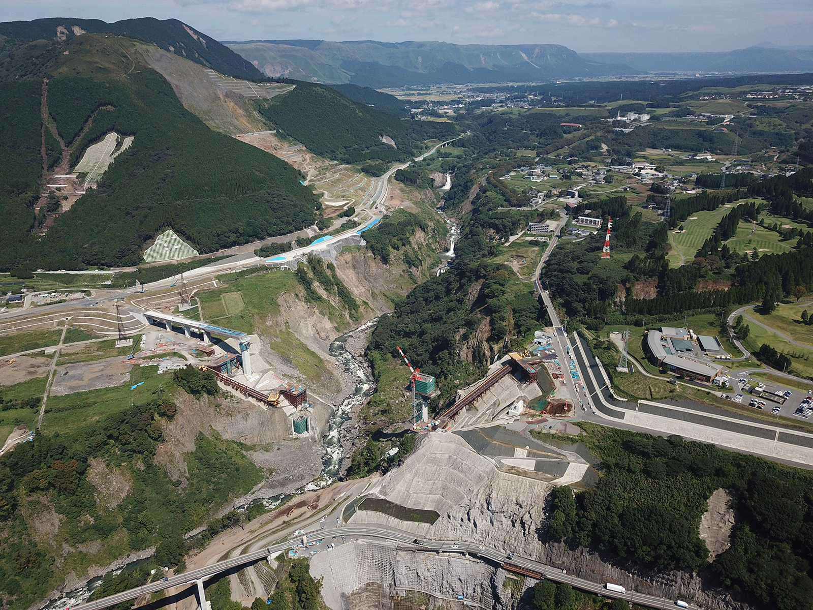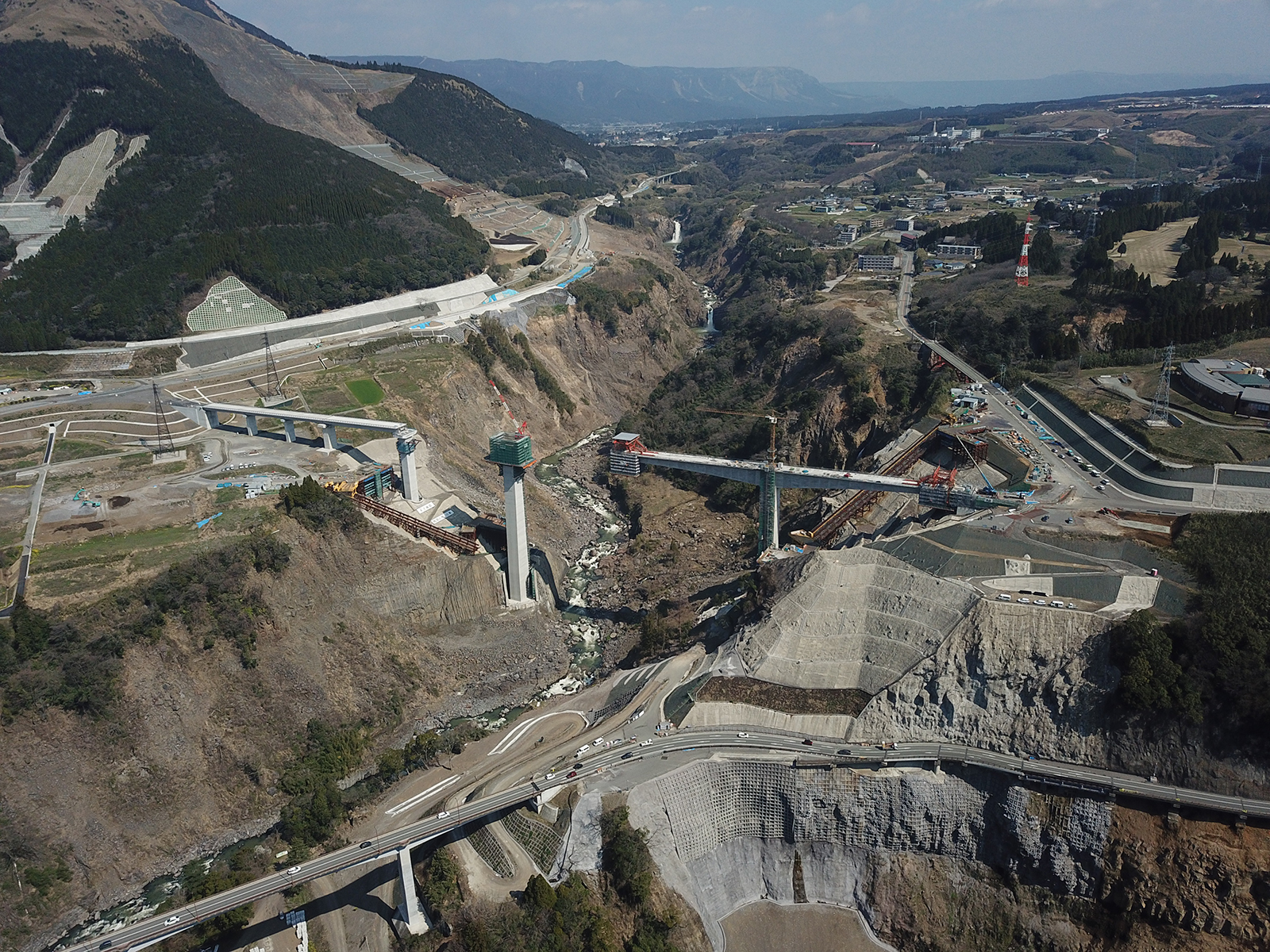 国土交通省九州地方整備局熊本復興事務所は、2016年4月の熊本地震で崩落した阿蘇大橋の架け替えを進めているが、54ブロックに上る上部工のワーゲン架設を進め、9月14日に中央径間の閉合(剛結)を完了した。既に側径間部分の桁架設は完了しており、今後は渡河部橋梁のPCケーブルの設置・緊張などを進めて行き、橋面工事や舗装工などを仕上げ、国道325号不通区間の来年3月供用を目指す。