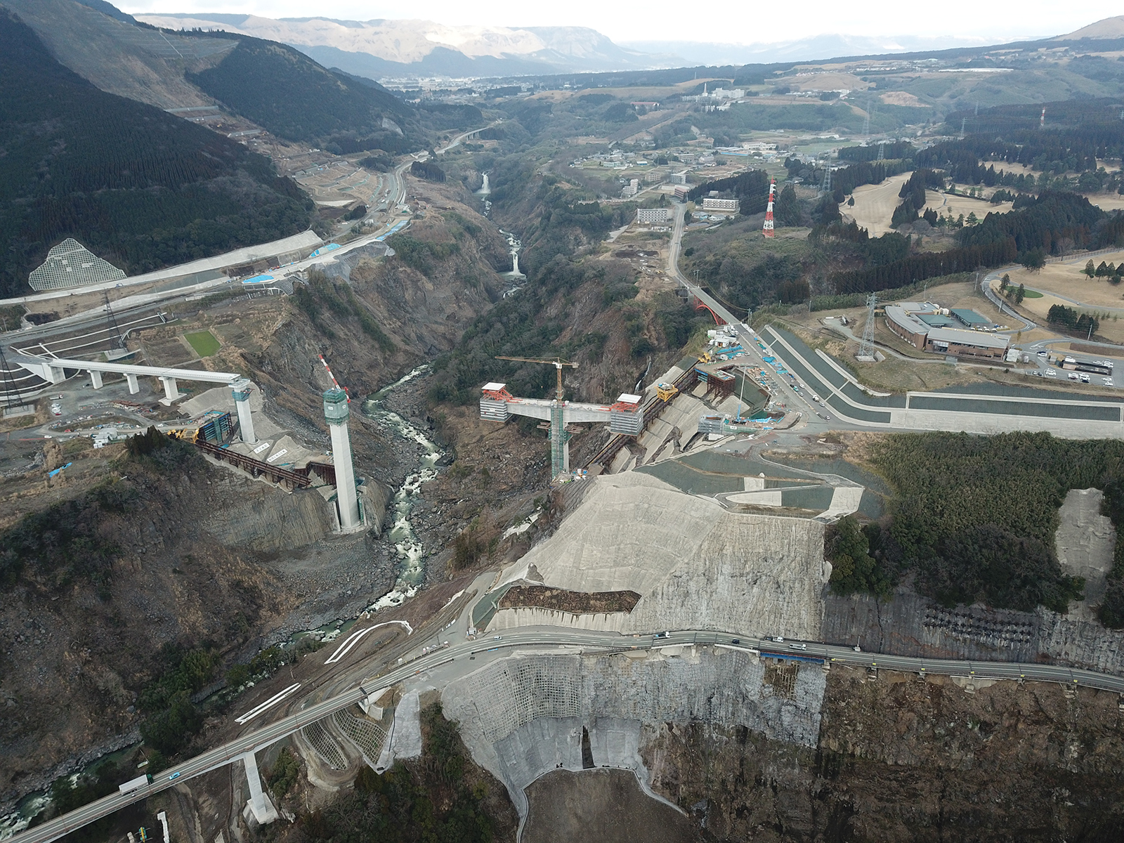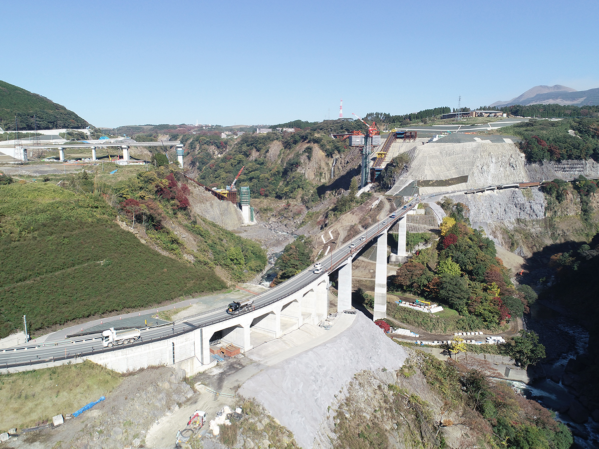 また、大成・IHIインフラ・八方JVの長尾賢二現場代理人は本NETの取材に対し「本工事は熊本震災からの復興事業の中でも事業全体の工程を左右し兼ねない難工事である。苦労したことは気象条件の厳しい環境の中、架橋地点が外輪山の入り口に位置し急峻な地形に沿って吹き抜ける強風が通年に渡りクレーンによる資材揚重作業に影響を及ぼしサイクル工程を確保するためには24時間の施工体制を余儀なくされる状況となり、そのための要員調達として全国各地から専門のプロフェッショナルを集結させ全体工程のクリティカルパスであるPR2橋脚の施工を予定通り完成することができた」と話していた。