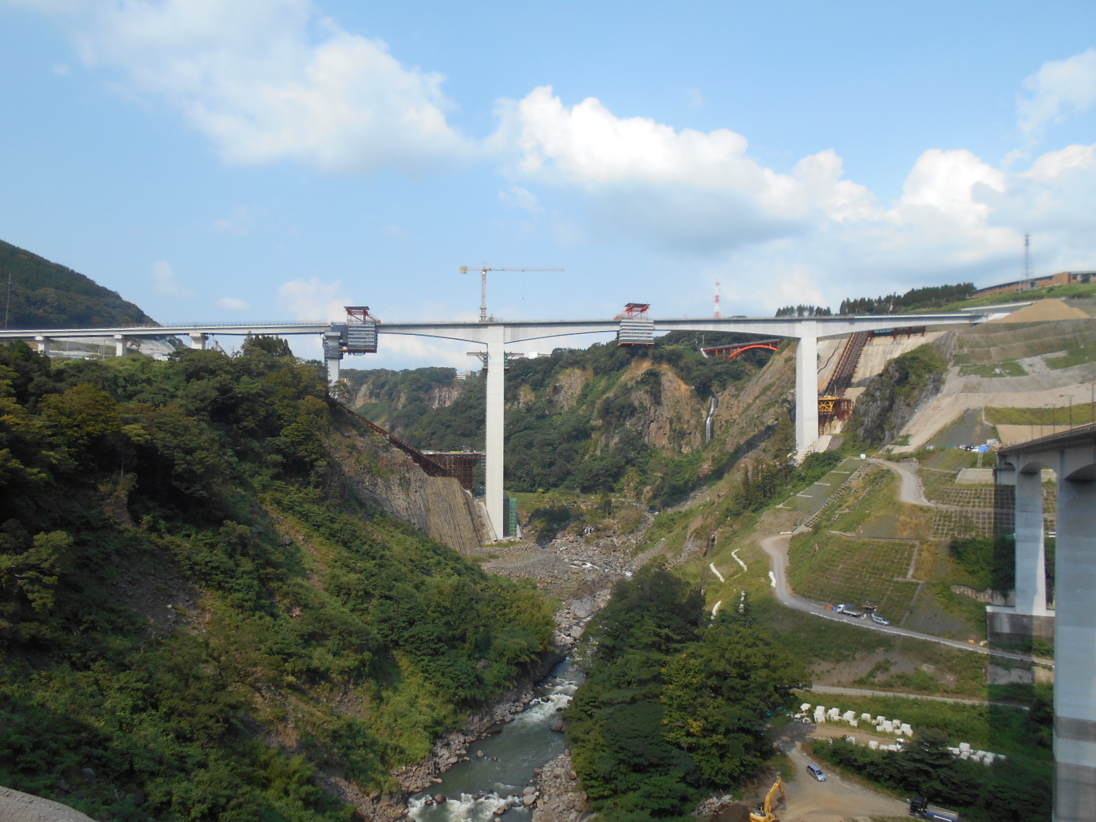 同橋は、施工効率化を図るための大規模なインクライン設置、下部工においては、柱状節理の崩壊を防ぐための竹割式土留め工法の採用、帯鉄筋のプレファブ化、クライミングシステムの採用、上部工の超大型ワーゲンを用いた施工など、工期短縮のための工法・材料を多く用いている。