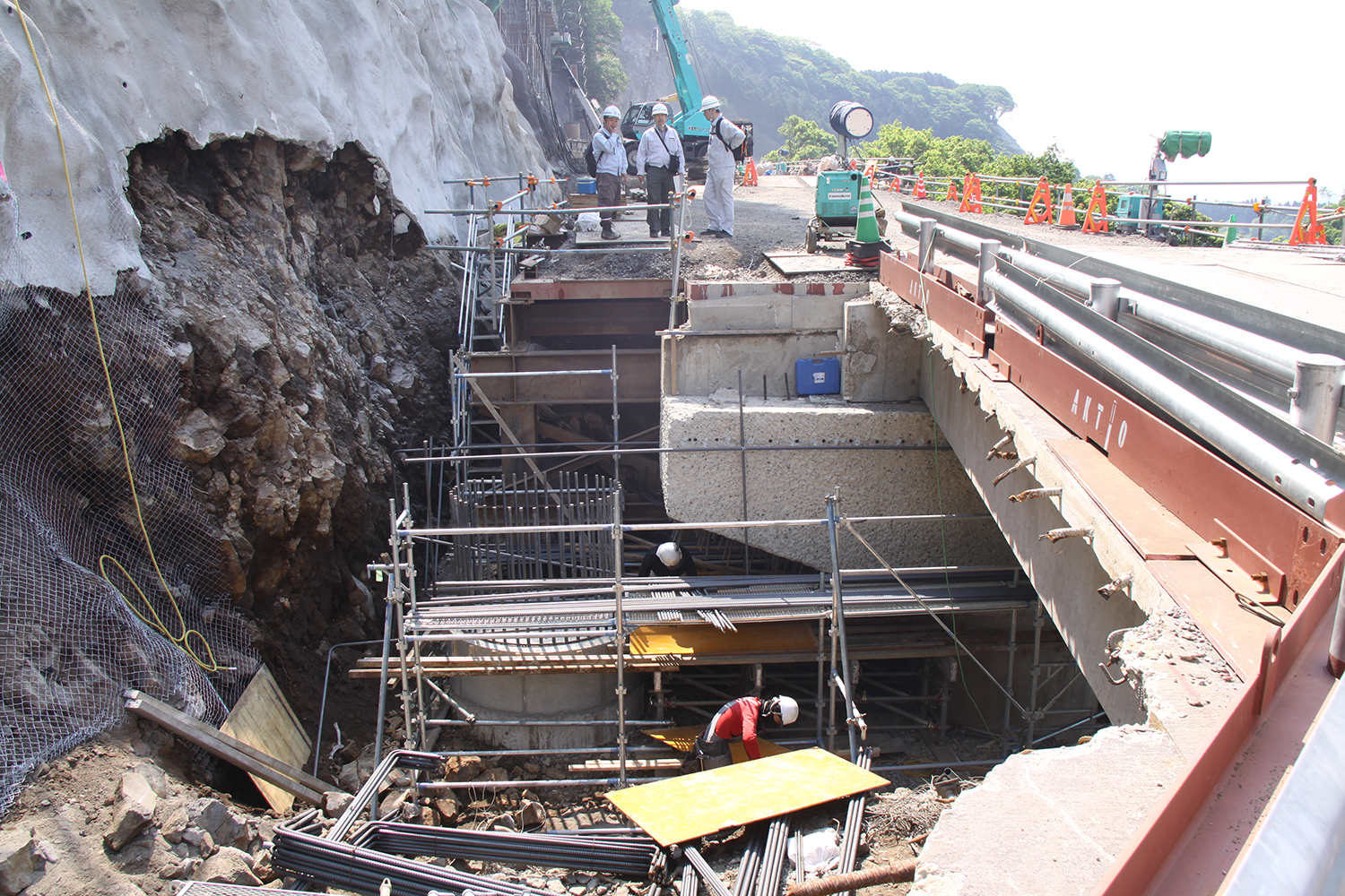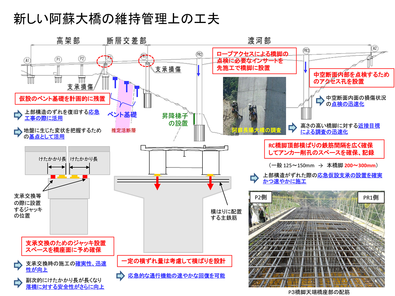 加えて、その後の点検に資するための様々な工夫も施している。P3~PR1間の斜面に架設のベント基礎を残置し、上部構造のずれを復旧するための応急工事や地盤の変状を調査するための起点として活用する。また、支承交換のためのジャッキ設置スペースを橋座面に配置し、支承交換を容易にした。地震時を想定して一定の桁の横ずれ量を考慮した横梁を設計している。RC橋脚頂部横梁の鉄筋間隔を広くして、桁がずれた場合の応急仮設支承の設置をやりやすくしている。