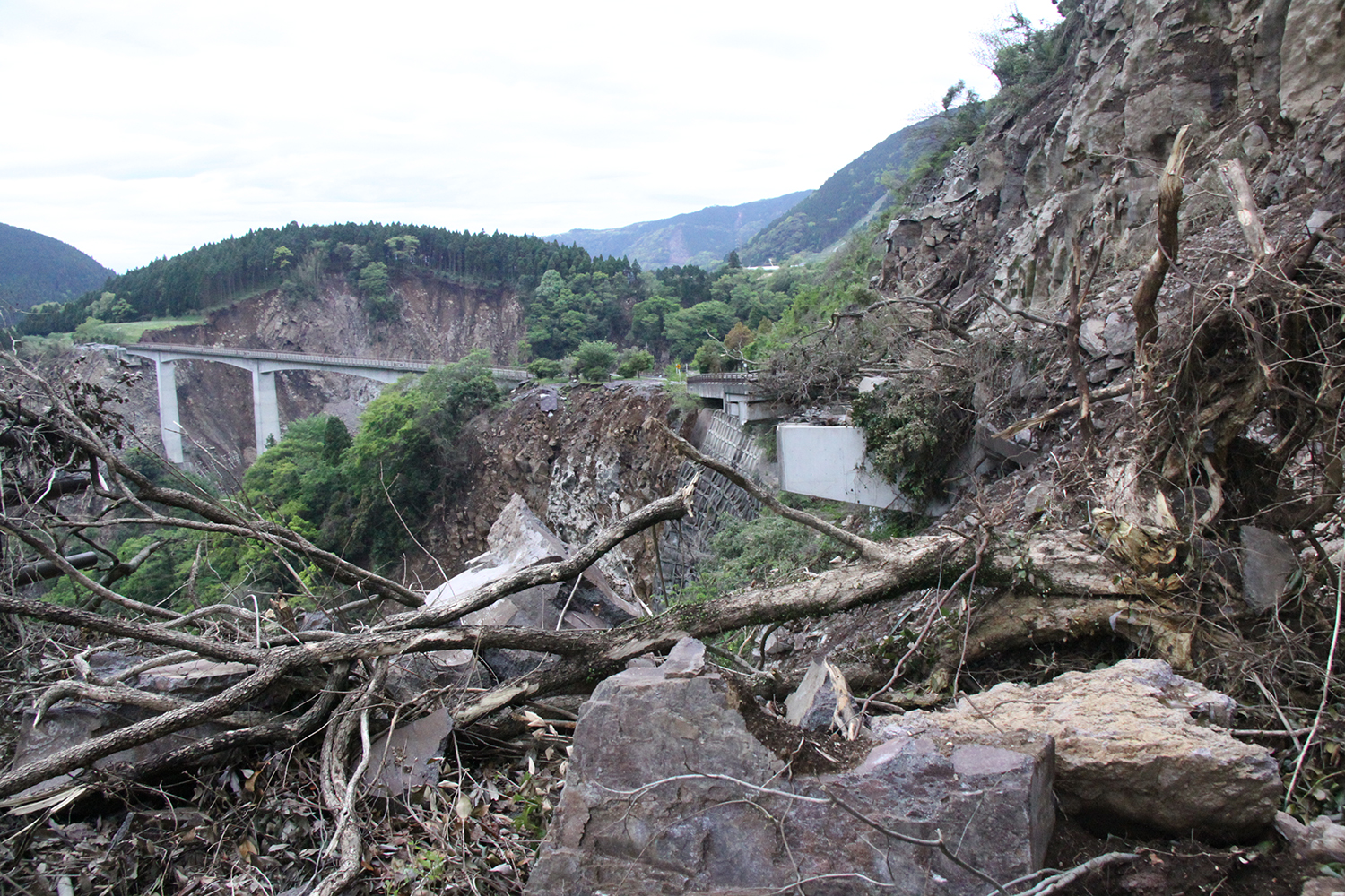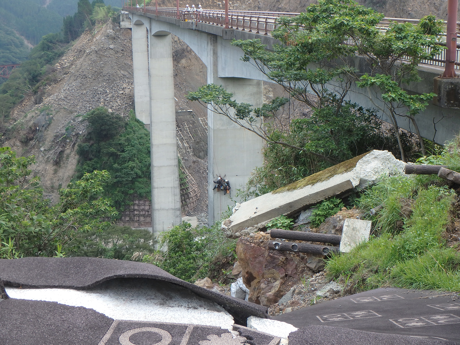 (左)発災直後の阿蘇長陽大橋の特殊高所技術による調査(特殊高所技術提供)