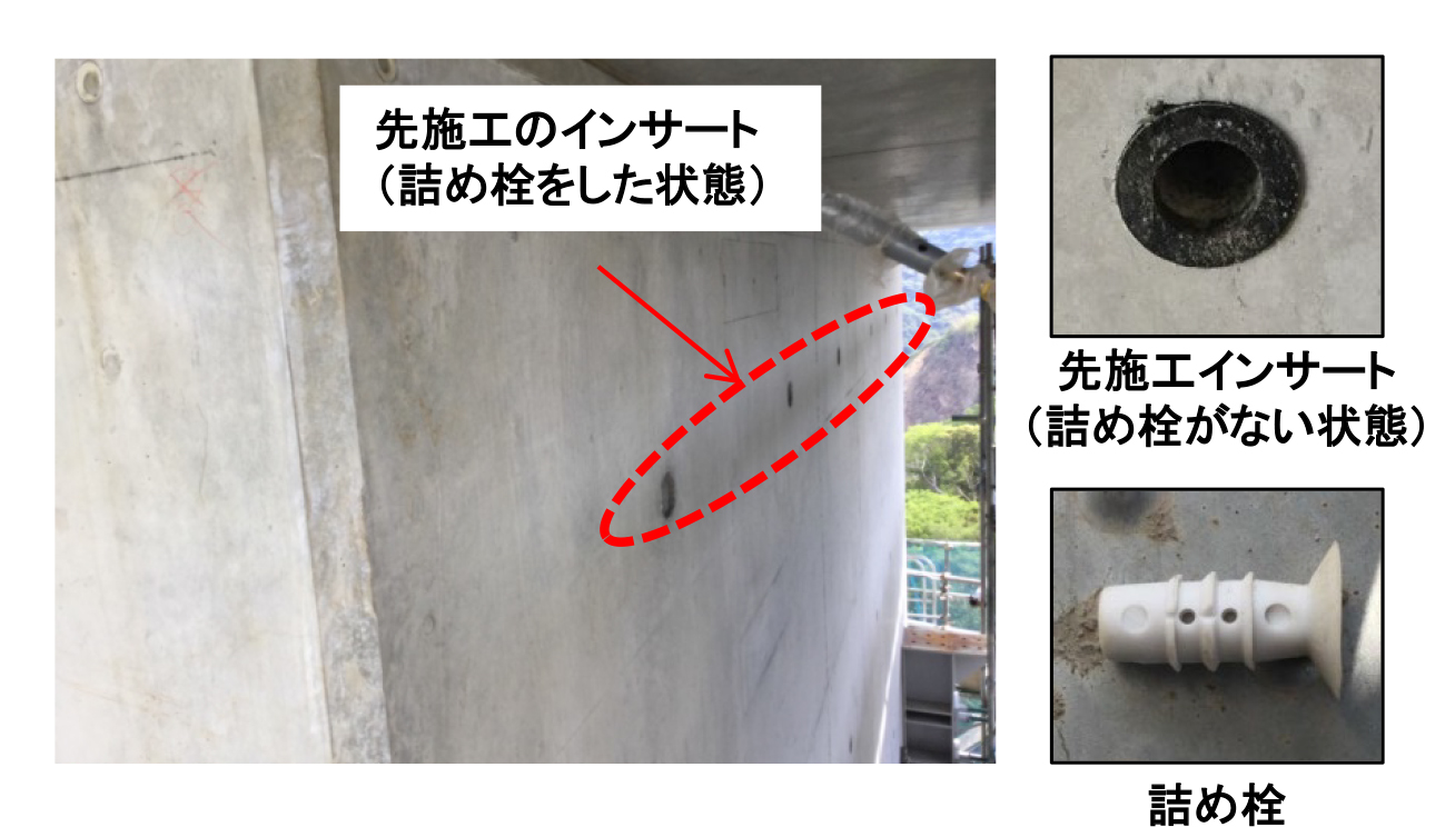 一方、阿蘇長陽大橋で、緊急点検の際に役立った特殊高所技術を活用するため、橋脚点検に必要なインサートを先施工で全周に40本ほど事前に設けた。通常はプラスチック製の詰め栓で閉めておき、地震などの有事の際は削孔することなく、橋脚周囲の移動のために必要な特殊高所技術上の中間点を設けることができる。