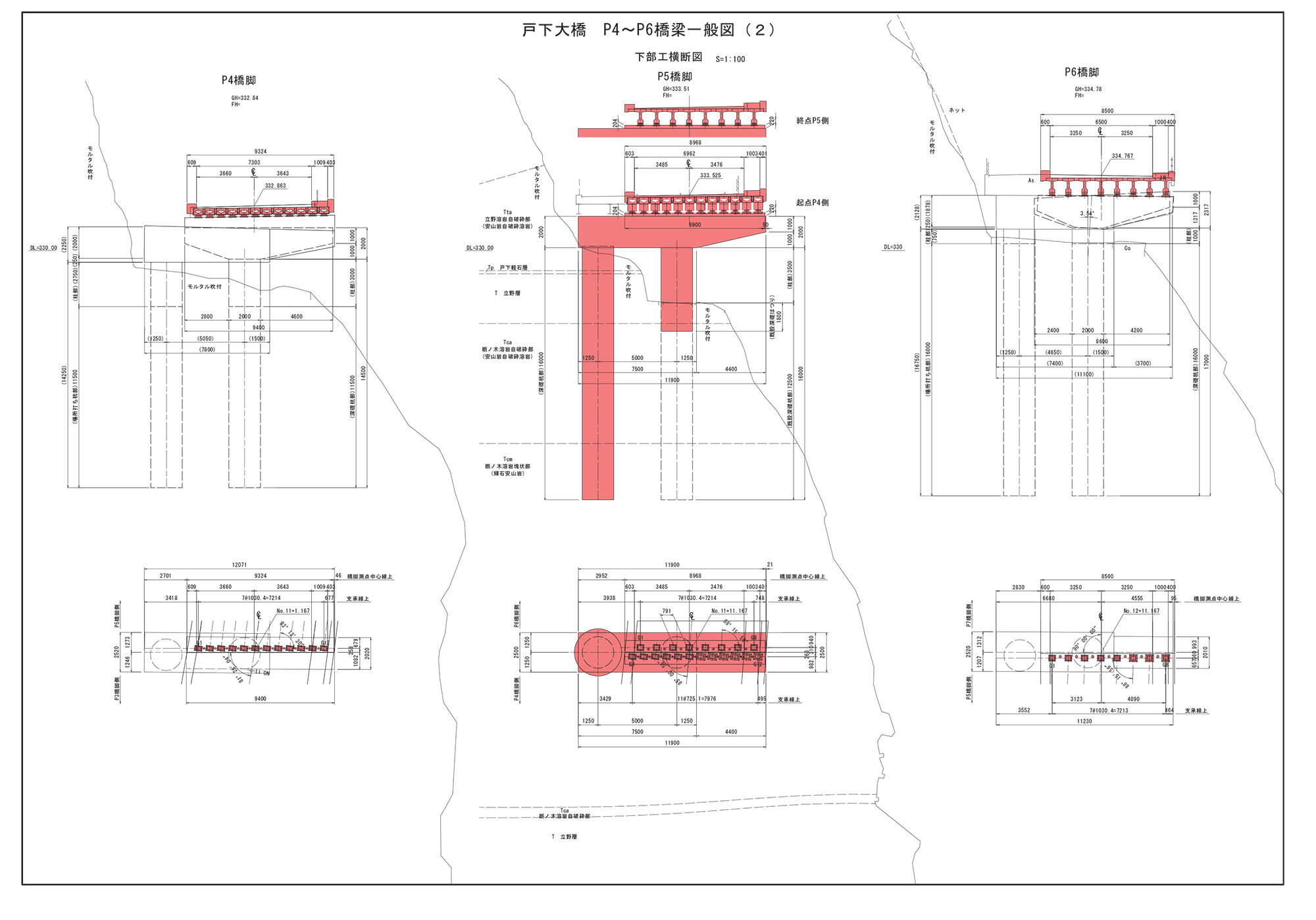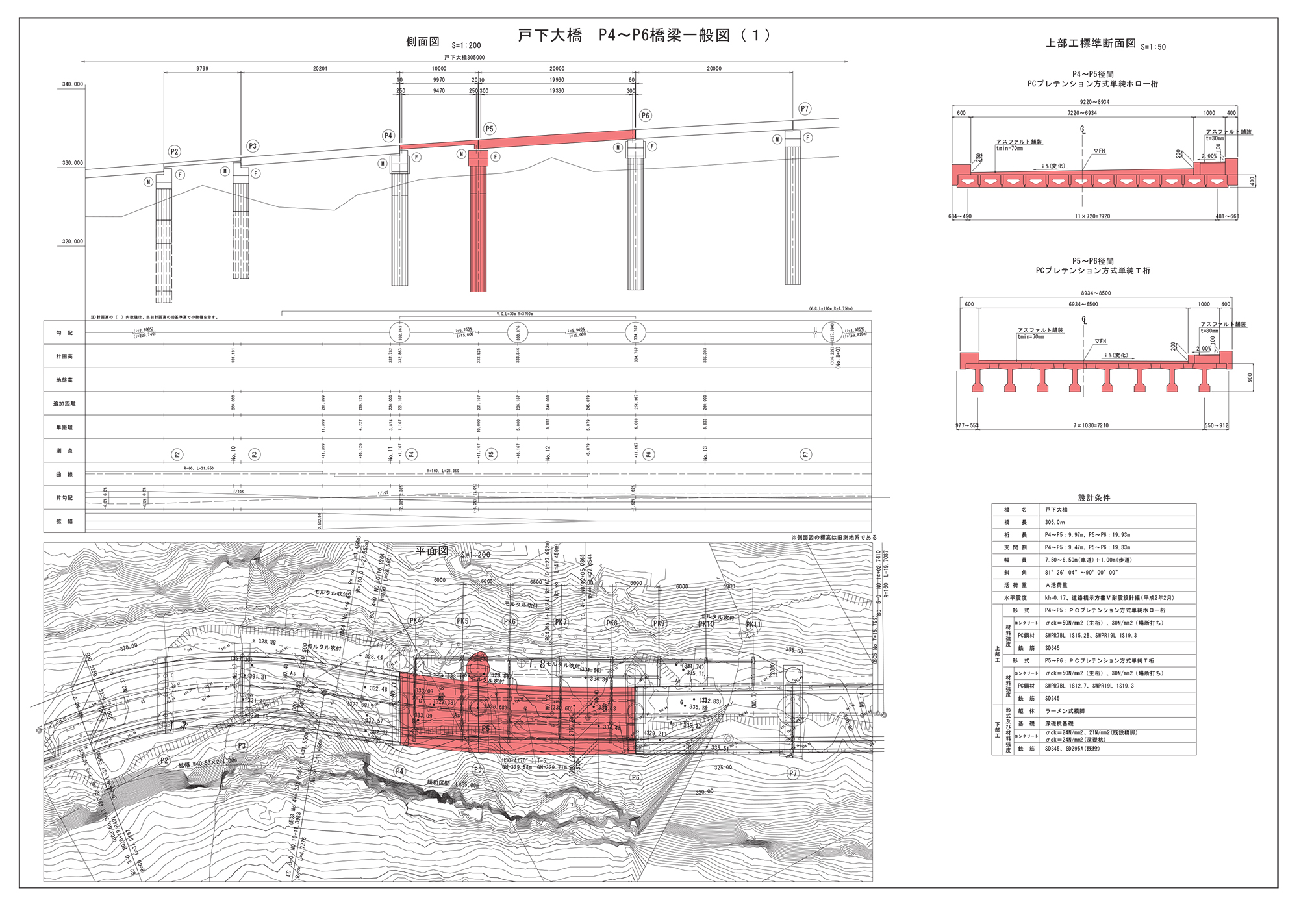 新しい阿蘇大橋の供用後は、同橋を含む国道325号線に交通を流し、一旦、現在の阿蘇長陽大橋を含む南阿蘇村道栃の木~立野線を通行止めし、仮復旧している戸下大橋のP4~P6部の本復旧工事を行う予定。上部工形式はP4~P5が桁長9.97mの単純プレテンホロー桁、P5~P6が桁長19.93mの単純プレテンT桁。P5~P6については山側に橋脚と深礎杭を1本増設する。