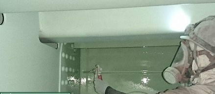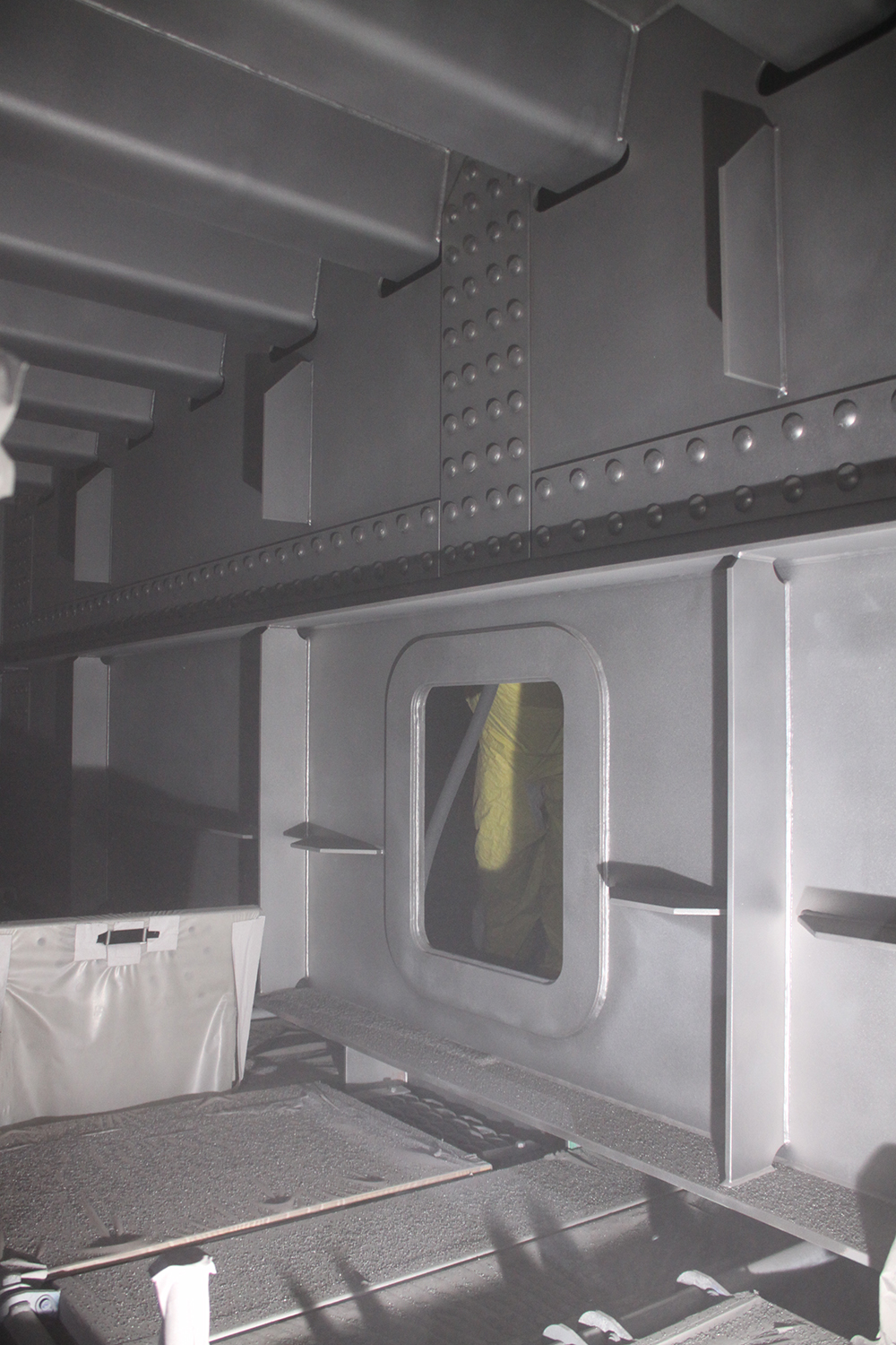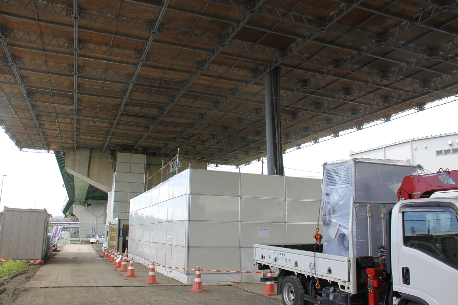 安全面では、粉塵防護として板張り防護とシート張りに加え、ブラスト用養生シートをシート防護2層目として設置している。また、外部へ粉塵を出さないために作業員の防護服に付着した粉塵を除去するため、クリーンルーム(右写真)を設けている。作業員はクリーンルーム内で防護服の着脱を行い、エアシャワーにより粉塵を落とした後にクリーンルームより退出している。