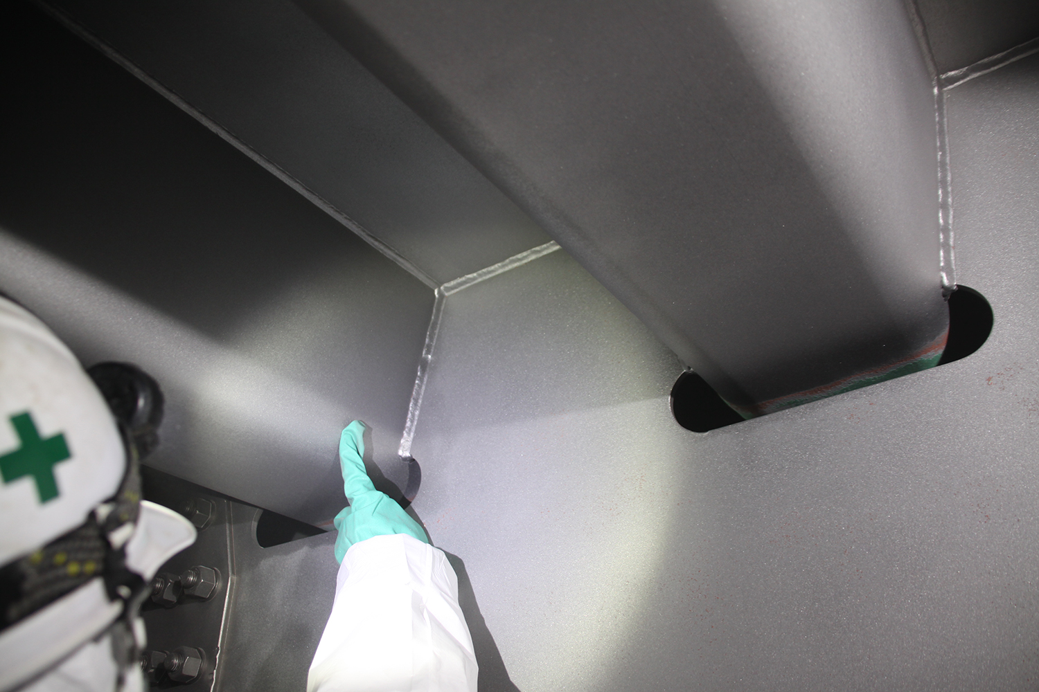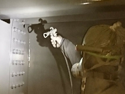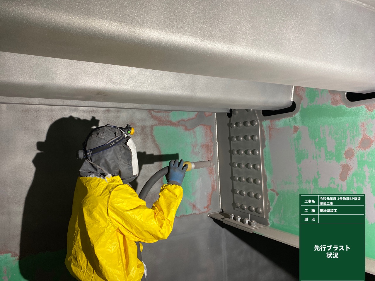 作業員の安全を確保の面では、場内にプッシュブル型換気装置を設置し、定期的な空気の入れ替えを行っている。火災事故を未然に防ぐため送風機など場内に置くものは全て防爆型とした。また、作業員は主にエコクリーンスーツを着用している。同スーツは全身を専用の使い捨て化学防護服で覆い、吸気口からその中に外部の新鮮な空気を送り込み、陽圧によりブラスト時の鉛などの有害物質を含んだ空気が入らないようにしている。加えてスーツ内部に送られる空気は23~25°に保たれており、夏場でも快適な温度環境で施工できる。ブラストの打ち手は、さらにこのスーツの上にナイロンヤッケを着用し、ブラストの研削材によるスーツの破損を防いでいる。標準の防塵マスクも着用しているが、これは「万が一スーツ内部への空気の供給が止まった時のバックアップとして装備している」(元請のヤマダインフラテクノス)ものだ。