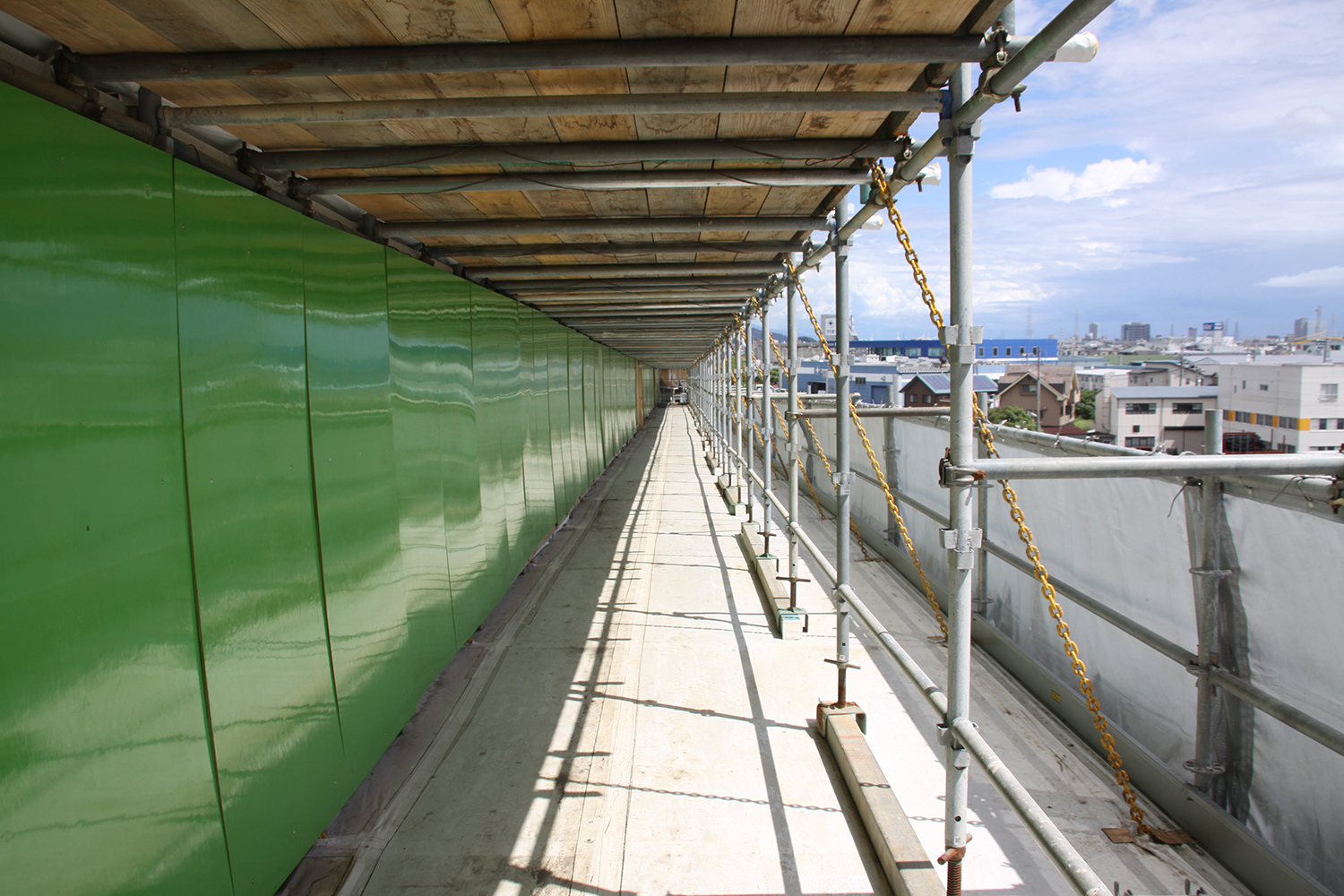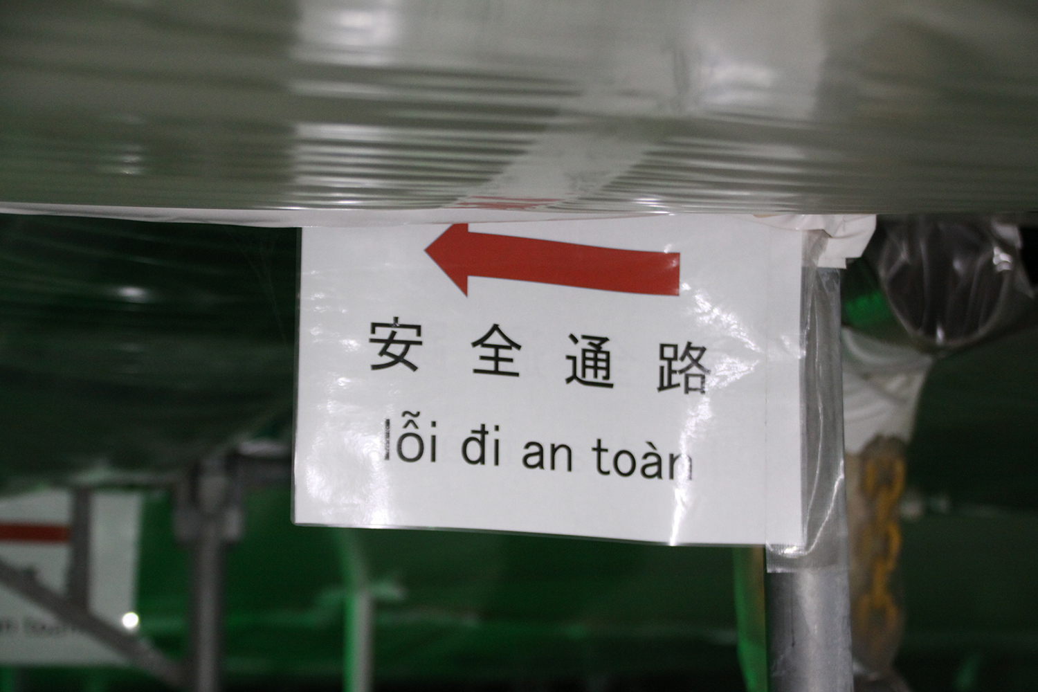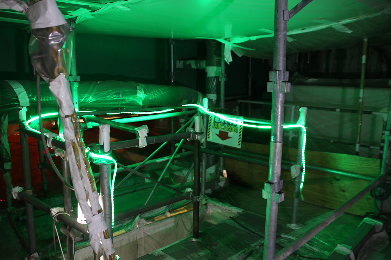同現場の一部では、危険表示や脱出経路の分かりやすさ、通路空間の確保についても意を砕いている。言語表示は日本語の他、現場にいる作業員の国籍に応じて併記(ここではベトナム語)している。また、昇降口には緑色のロープライト、脱出経路には赤色のロープライトを設置することで日常の移動や、有事の避難をし易いように配慮した。両張り出し部の足場幅は1,800mmを確保し、避難時に移動しやすくしており、脱出用ロープも複数個所に配置し逃げやすくしていた。