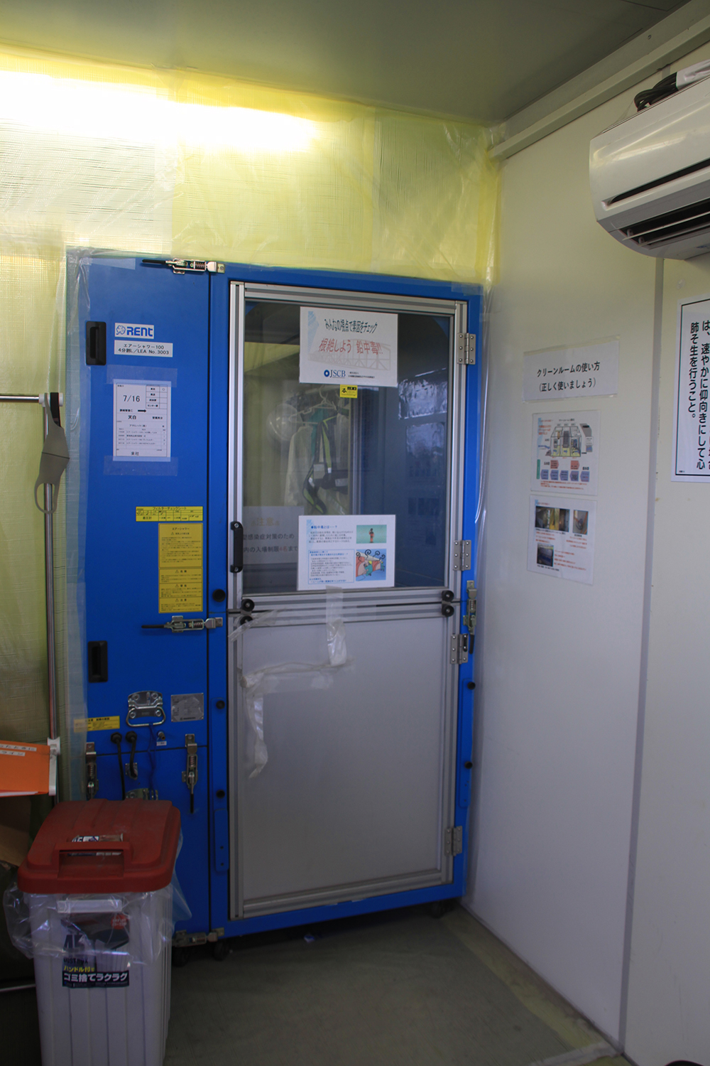 安全面では、粉塵防護として板張り防護とシート張りに加え、ブラスト用養生シートをシート防護2層目として設置している。また、外部へ粉塵を出さないために作業員の防護服に付着した粉塵を除去するため、クリーンルーム(右写真)を設けている。作業員はクリーンルーム内で防護服の着脱を行い、エアシャワーにより粉塵を落とした後にクリーンルームより退出している。