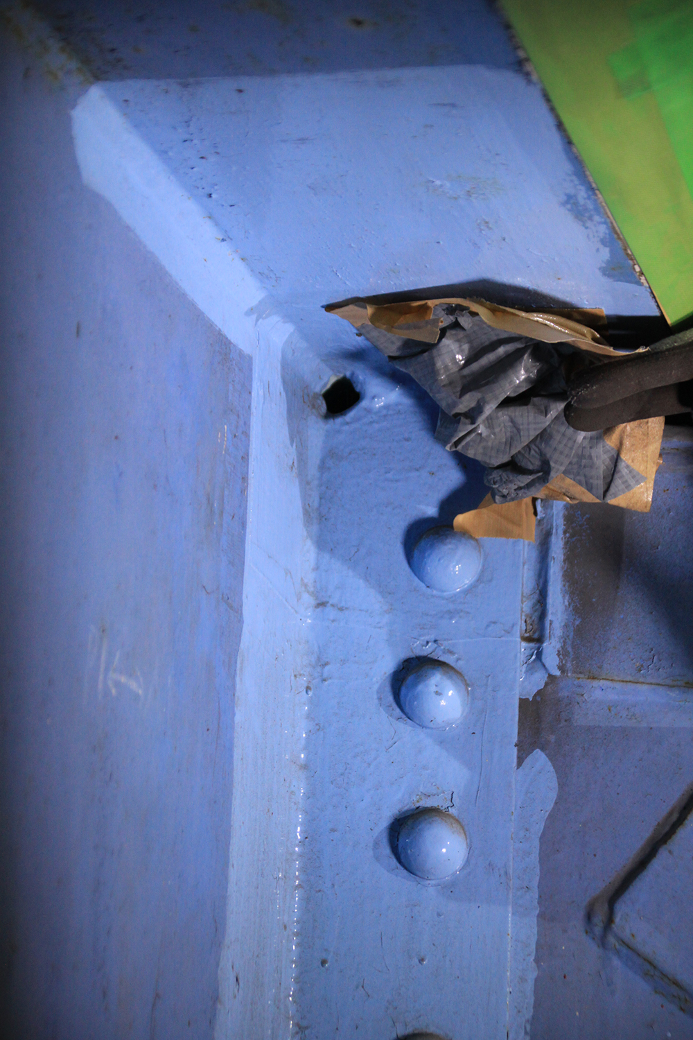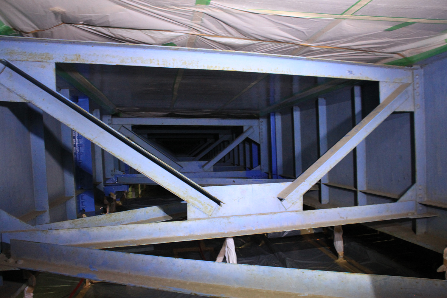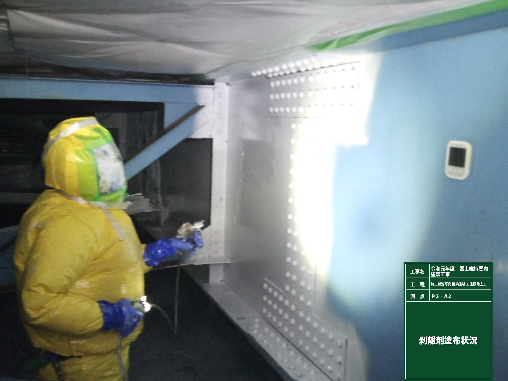 塗膜剥離剤は1日350㎡程度吹付け、24時間程度養生した後、掻き落とす。ブラストは1班(4ノズル)体制で施工し、1日平均160㎡ずつ施工していく。