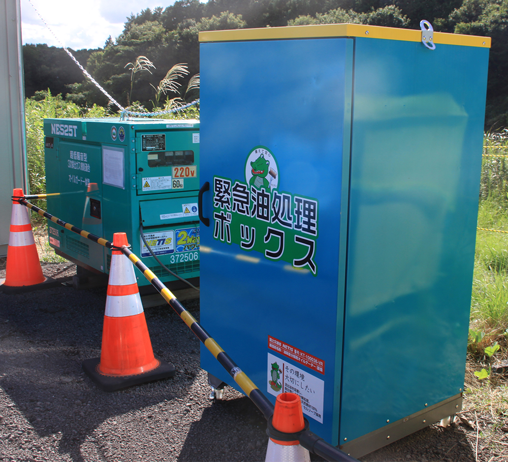 安全対策は、安全通路は若干狭い(1,100mm)ものの、基本的に東名巴川高架橋の現場に準じている。なお、直下の潤井川は下流で漁業も盛んなことから、油の流失などによる事故を防ぐために、緊急油処理ボックス(右写真、NETIS:KT-100036-VE)を設置している。