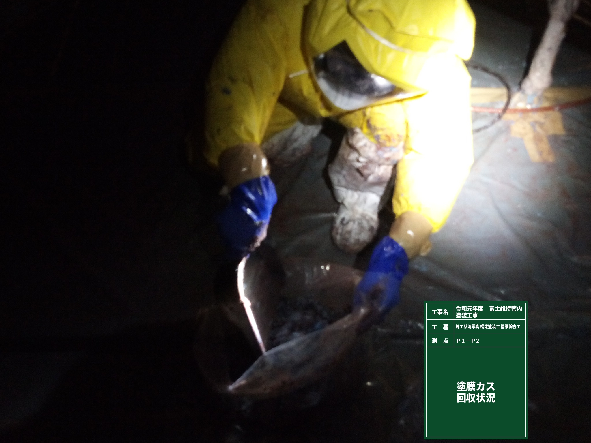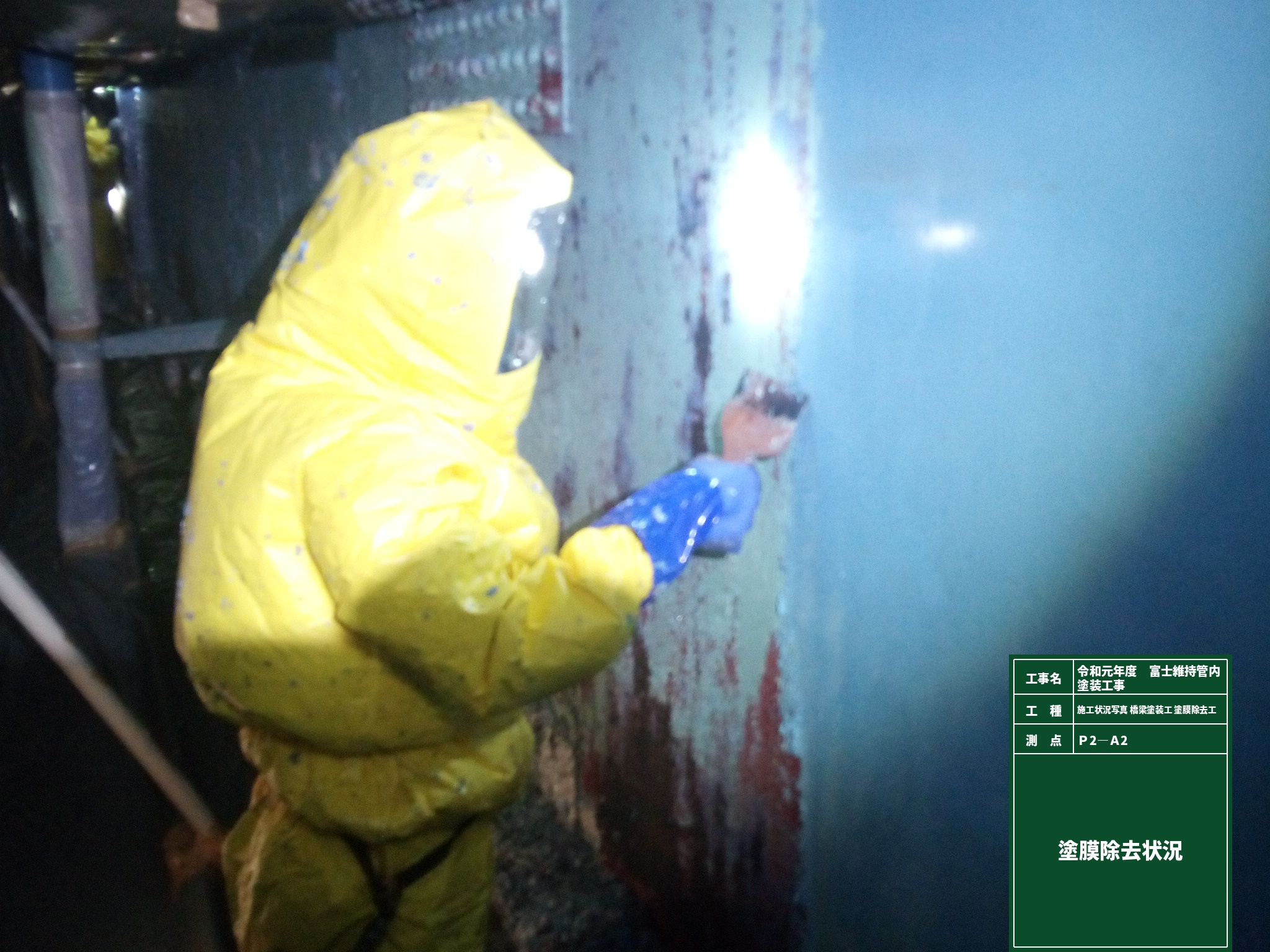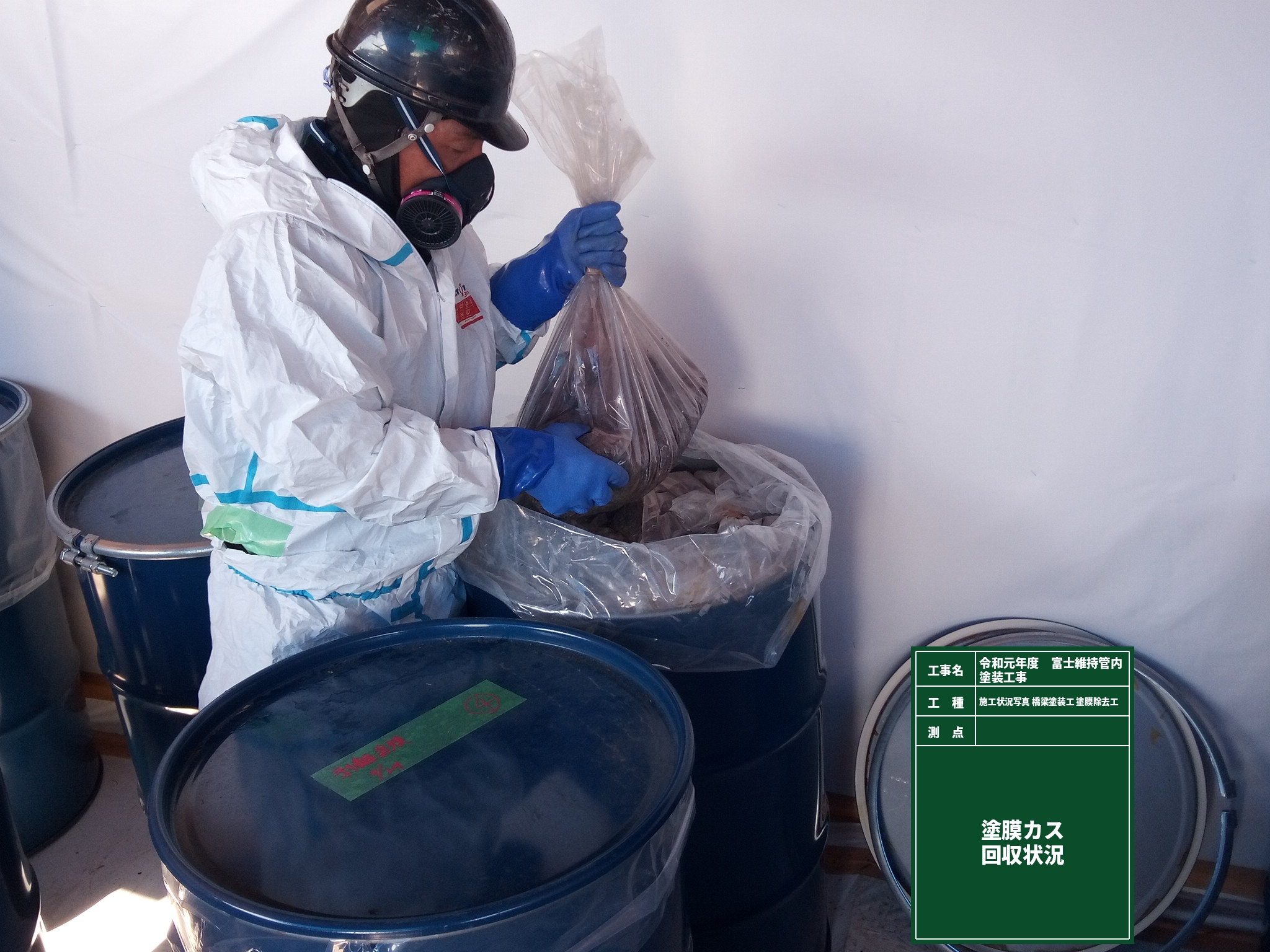 大沢大橋は、富士山にほど近い富士宮市上井出の国道120号が潤井川を渡河する箇所にある橋梁だ。1971年8月に当時の日本道路公団(JH)によって供用された3径間連続非合成3主鈑桁橋で、膜厚は250~320μmであるが、複数回以上、3種ケレンによる塗り重ねを繰り返した形跡がある(前回塗替えは90年1月)。塗膜は鉛またはその化合物が69,000mg/kg、PCBが13㎎/kgと高い数値を示している。そのため、塗膜剥離剤によって既設塗膜を膨潤させて限界まで掻き落とした後、残った鉛丹などの除去と素地調整を循環式エコクリーンブラストで施工し、その後ミストコート、塗替え塗装(弱溶剤系重防食)を施していく。