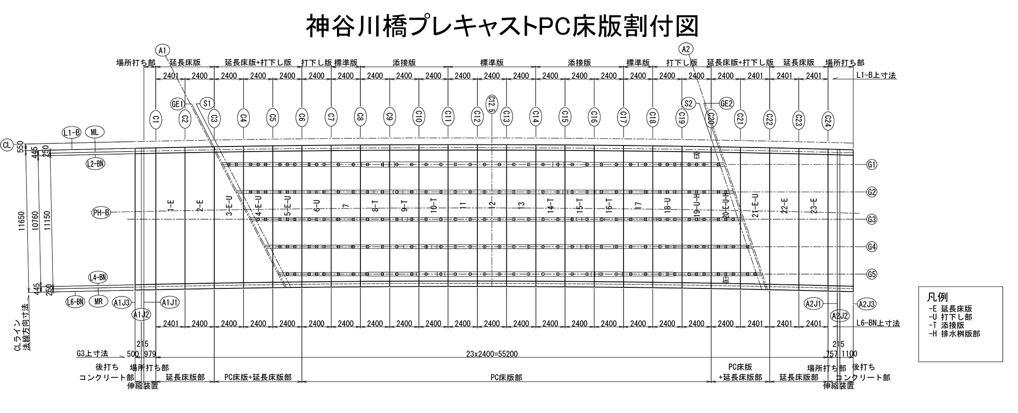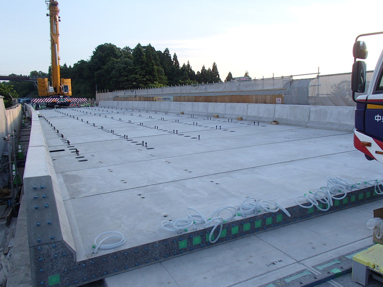 新設床版は、延長床版込みで23枚を2日間で架設した。(延長床版は底版施工後)、延長床版も含め、斜角が入っているが床版は直角で並べる。伸縮装置も直角配置とした。布施川橋では添接板を6枚ほど設けて緊張しているが、神谷川橋では両橋台の端部で緊張を架けるため添接板は使用しない。両橋とも標準床版厚は240mm。