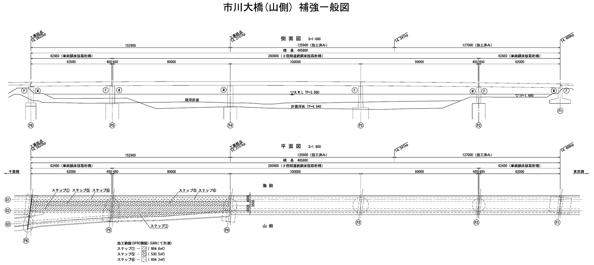 市川大橋(山側)は1980年10月供用された橋長405.8mの単純鋼床版箱桁+3径間連続箱桁橋である。鋼床版はUリブで板厚は12mm。設計示方書は昭和47年道示となっている。交通量は平成27年センサスで約40,000台であり、大型車混入率は約46%に達する。片側3車線で歩道に近い側と中央のダブルタイヤが載荷する箇所で、負曲げの影響により損傷が生じており、デッキプレート貫通亀裂が2,000箇所、スティフナーの溶接亀裂が600箇所で生じていた。平成24~26年度にかけて当時損傷していた箇所を当て板補強(損傷個所に板厚12~15mmのプレートを高力ボルトで締める形で補強)しているが、今回さらにSFRCとCFRPグリッドによる鋼床版上面補強を行っている。