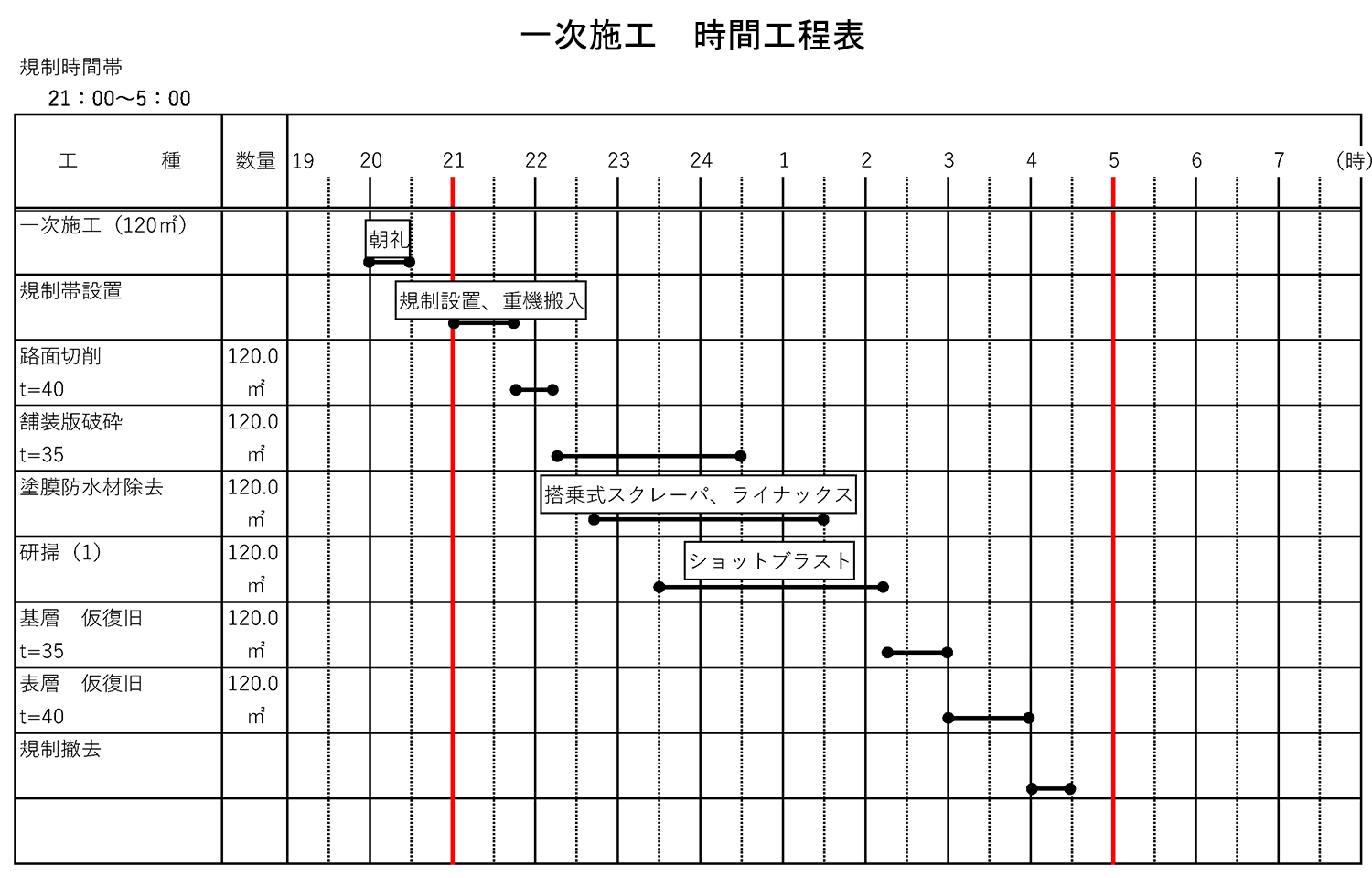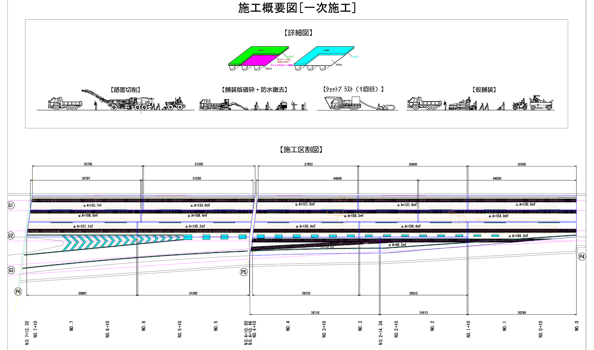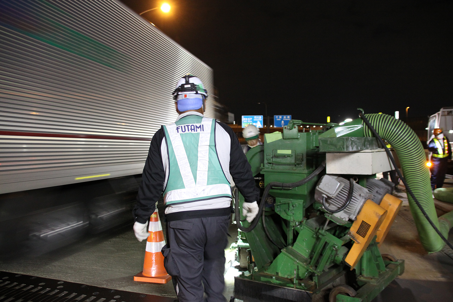 まず準備工ではレベル測量、面積計測、既設舗装厚の確認がなされる。舗装撤去の効率性と鋼床版の保護の観点からは既設舗装厚の確認がとりわけ重要であるが、これはストラクチャスキャン(電磁波レーダー法を利用した非破壊検査機、主にコンクリート内部の空洞や鉄筋探査に用いられる)を使用して測点ごとに舗装厚さを計測した。次工程での切削厚さを決め、鋼床版を傷つけず、できるだけ深く切削できるようにするためのもの。縦断方向の測線は1本/10mとし、形状が変化する箇所においては測線を追加した。横断方向は1mピッチで測定している。