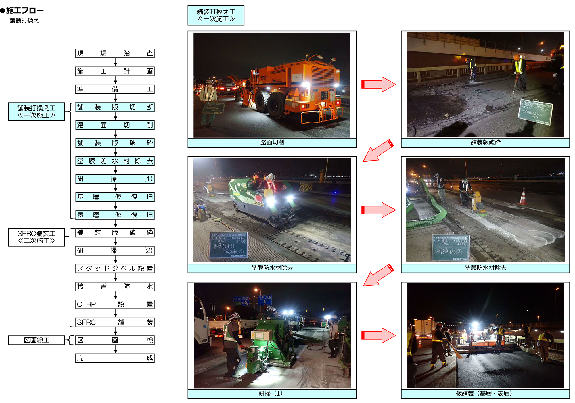 さて、今次の鋼床版上面補強の工程は3つに大別できる。最初は準備工、次に既設舗装の撤去及び仮舗装、最後に仮舗装撤去からショットブラストによる鋼床版面研磨、スタッドジベルの設置、接着防水の塗布、CFRPグリッドの設置、超速硬SFRCの打設および養生である。