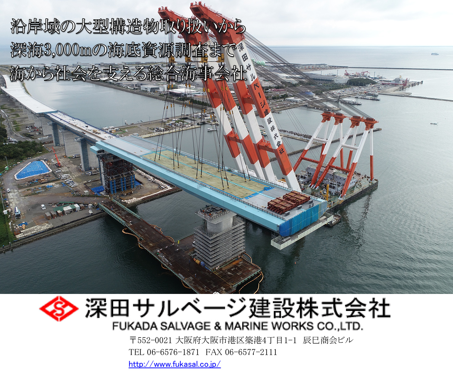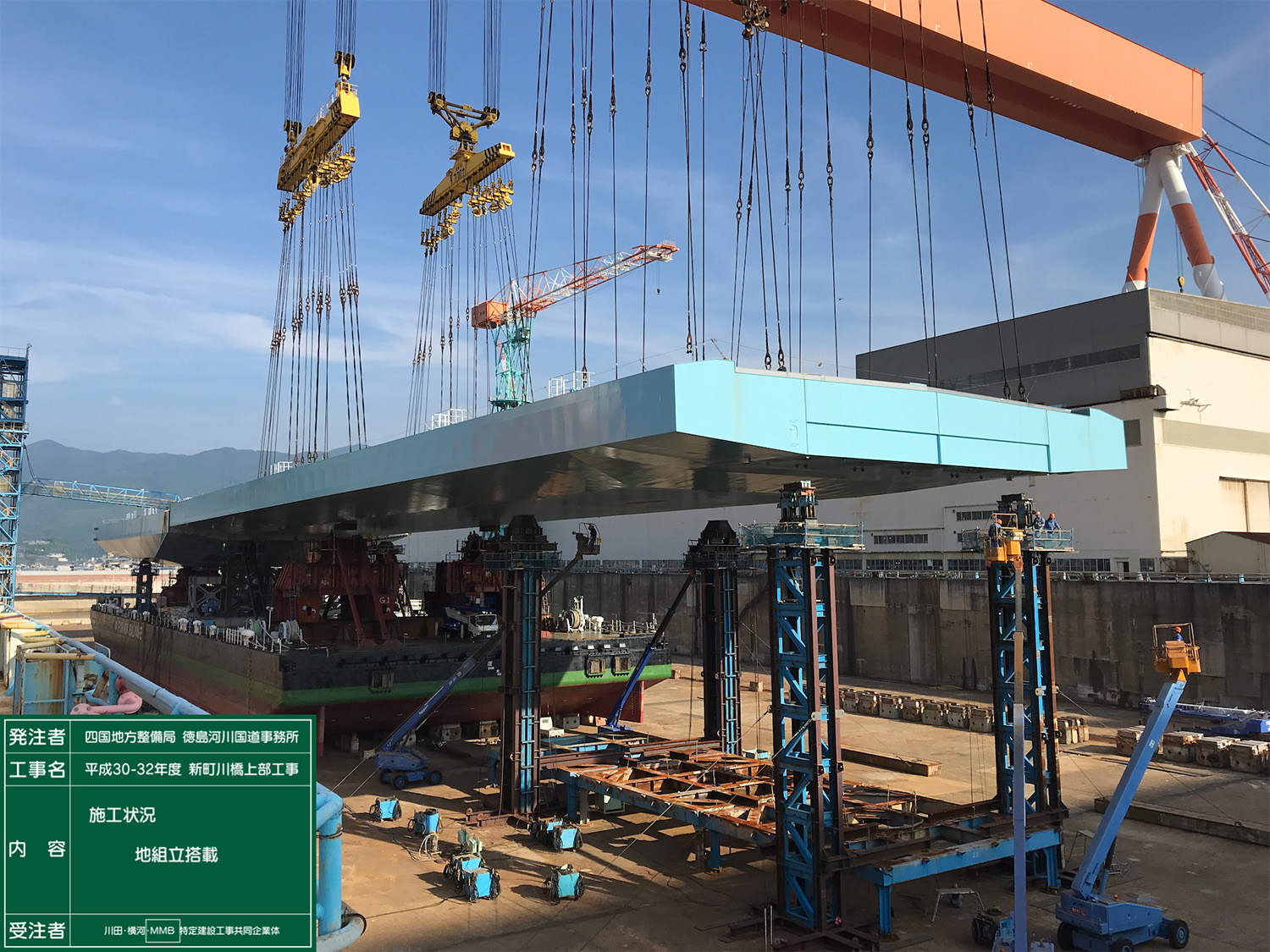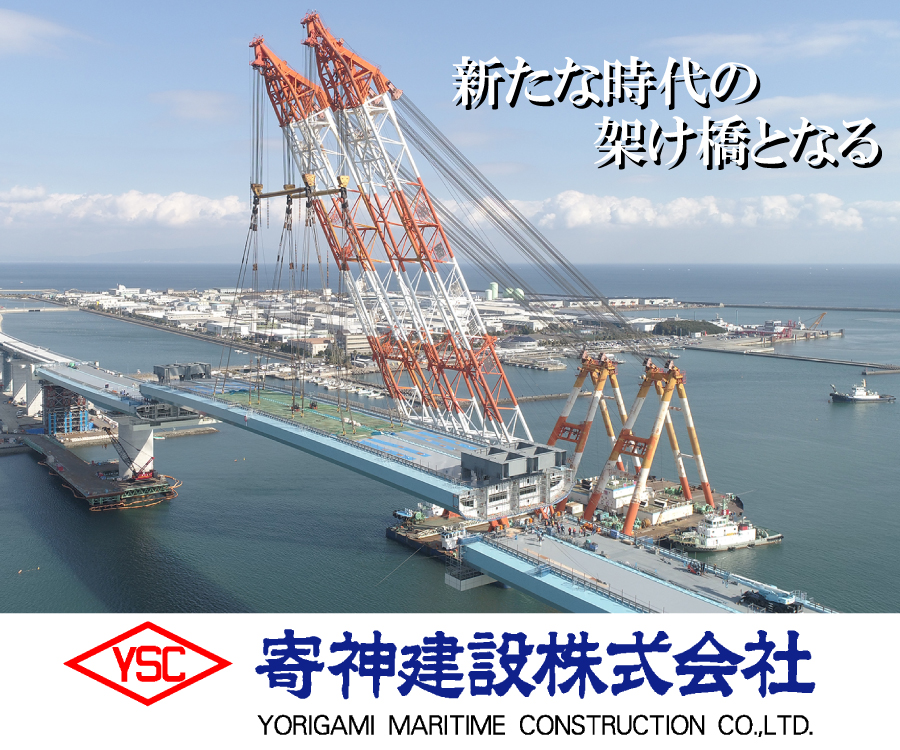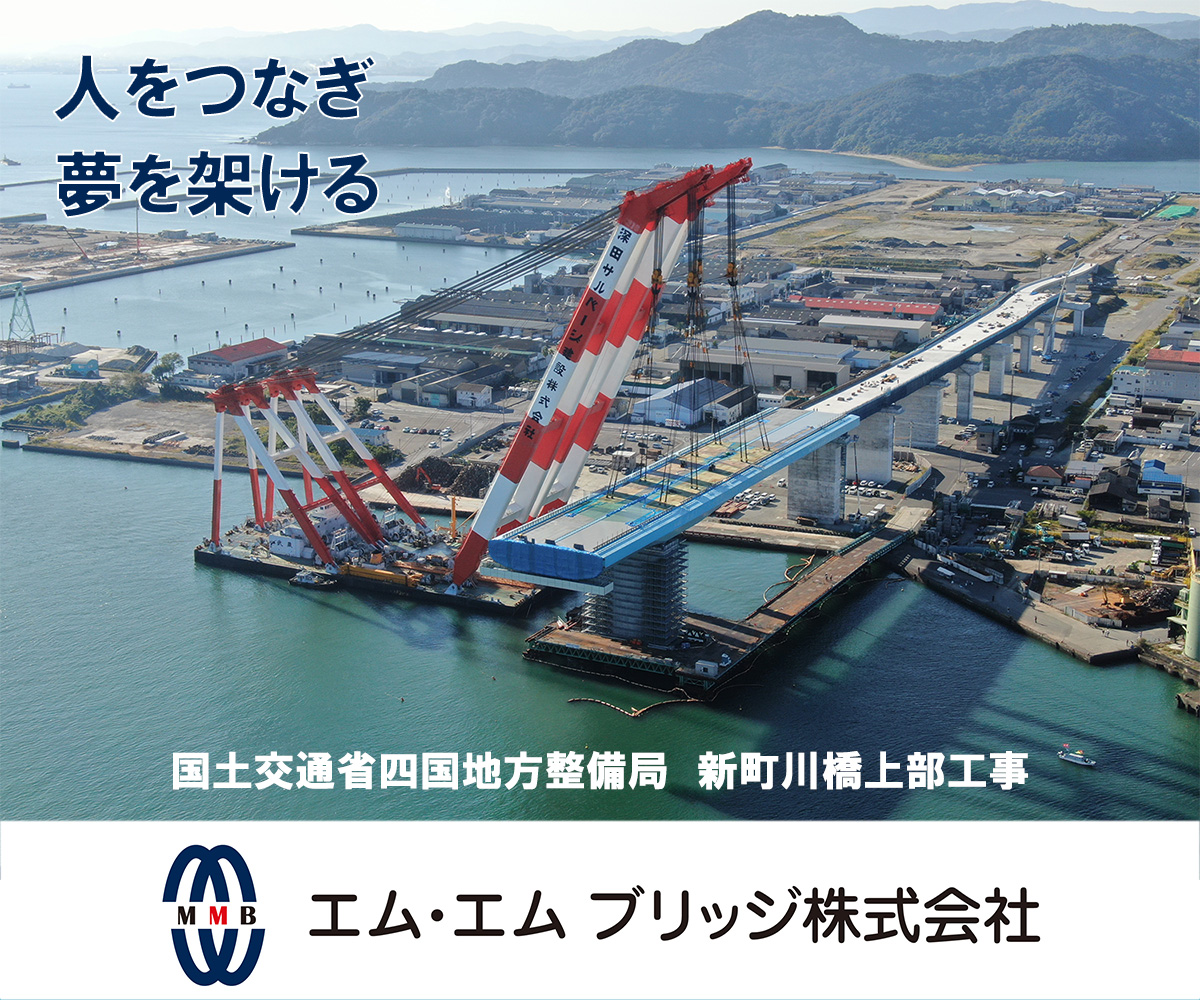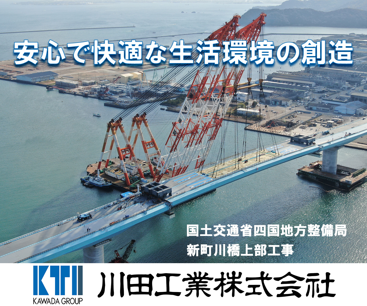 国土交通省四国地方整備局徳島河川国道事務所は、2020年12月5日、徳島南部自動車道徳島津田IC~徳島沖洲IC間の新町川渡河部に建設を進めている新町川橋の閉合桁架設を行った。4ブロック中3ブロックの吊荷重が3,000tを超えていることから、FC船は深田サルベージ建設の「武蔵」(定格荷重3,700t)および寄神建設の「海翔」(同4,100t)を採用した。武蔵が先行3回分、海翔は最終ブロックの架設を担当した。同橋について設計・施工上の課題をどのように克服しながら、現状までこぎつけたのか、上部工を中心に取材したものをまとめた。(井手迫瑞樹)